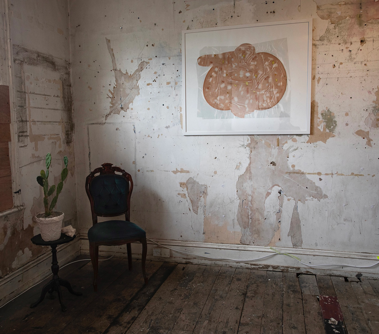With recessed spaces either side of the domestic fireplace bulging with a sculptural montage of organic-looking matter, the walls look alive. In the semi-dilapidated shell of a suburban home, the artistic intervention is camouflaged against the stripped back decayed fabric of the space, blurring the line between the artistic acts and those of damp, decay, or de-decoration of the space in preparation for its next reimagining.