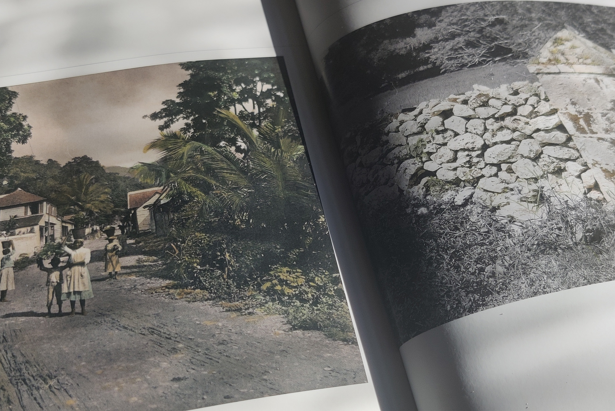 A vitrine displays Pollard’s sketches and experiments as she seeks to identify and extract these individuals, eyes look out from a window of a cottage straight into the Valentines’ lens, what we are thinking we will never know but she is looking at us in 2022 as much as anyone looking in 1891. It is not just those who are present picked out in these small images, two images show the gateway to Mount Plenty Great House, formerly owned by John Hiatt, owner of 31 slaves.[2] The dry stone wall, shown in photographs set within a picturesque frame with cart track winding through, and then closer to be able to see the detail of the construction work, would have been built by that enslaved labour. Pollard says “I can hear the carriage going along to the house” when she looks at this photograph, the wall constructed by enslaved people being in their place, and the Valentines photograph of it created to sell the place through looking.