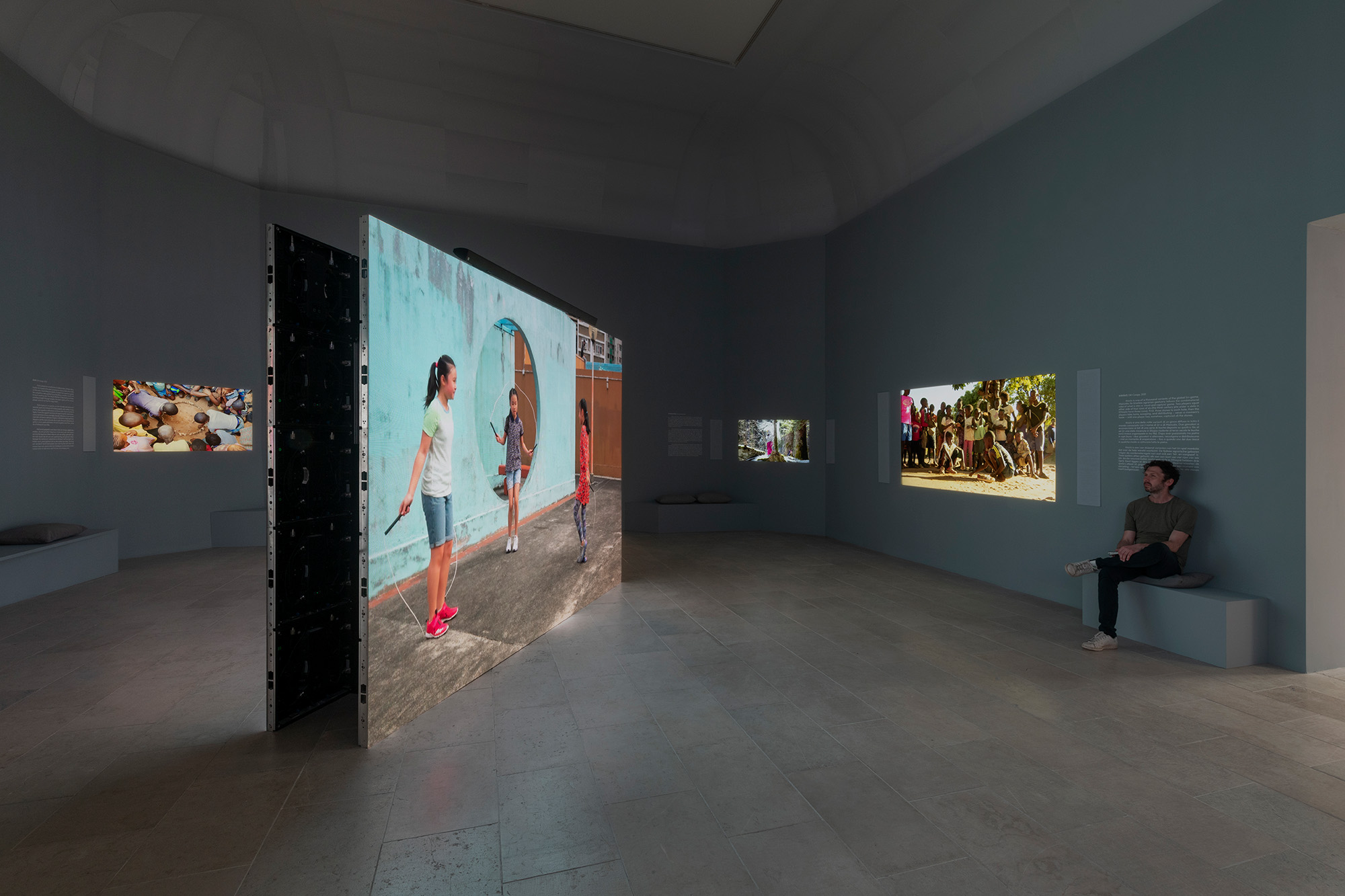 The central chamber of Belgium’s Pavilion at La Biennale is a loud place. Visually, it is packed with large HD monitors displaying looping videos of children playing games all over the world. Sonically, it’s chaotic, the screaming, shouting and sheer joy of the playful kids – each video’s sounds overlapping with the others to create a school-playground soundscape – is such that the noise leaks outside of the main entrance and into the polite and mannered Giardini gardens.