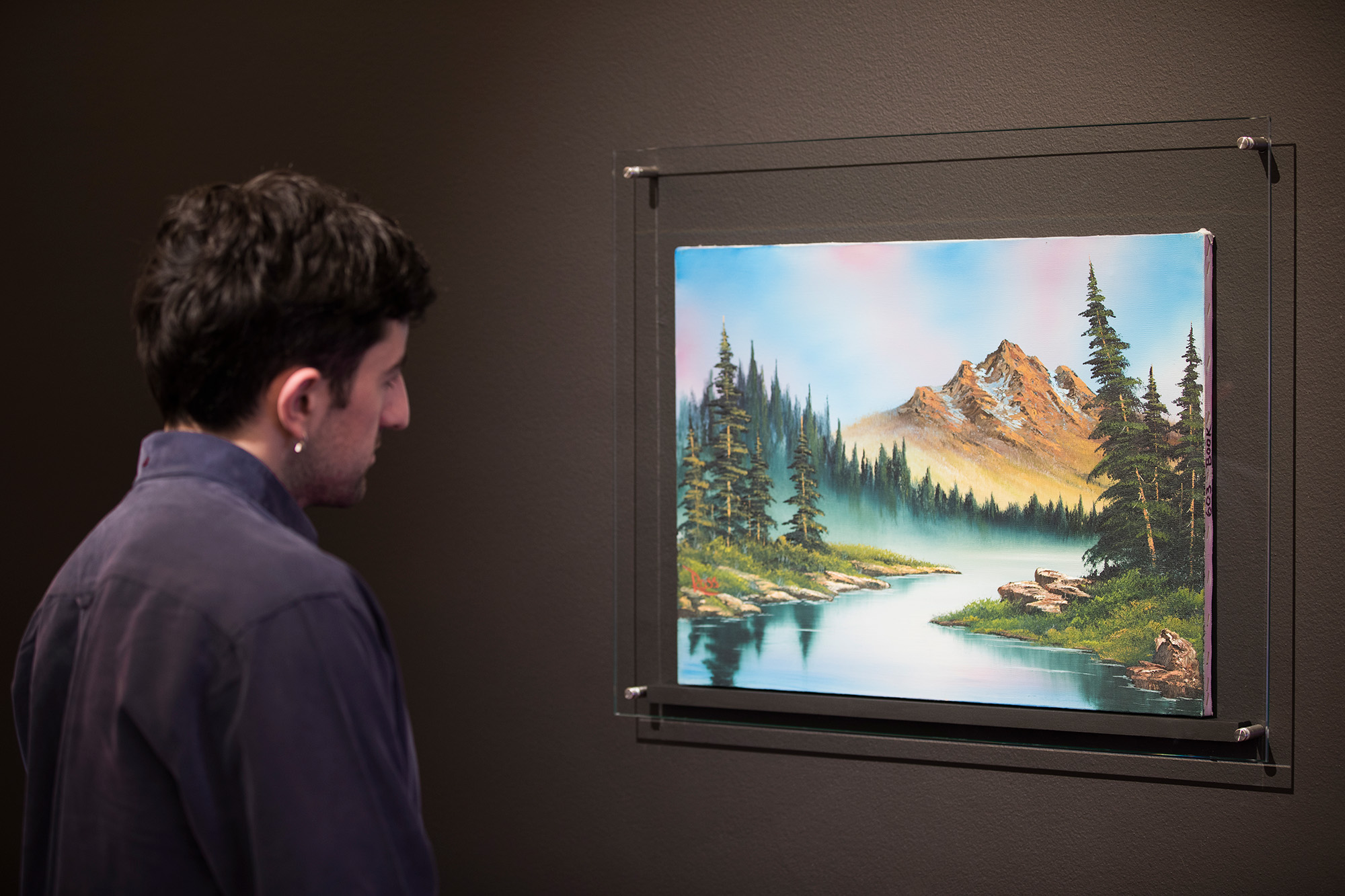 In the exhibition, we have seven works by Bob Ross, a fairly iconic figure, but also an interesting bridge point within ASMR. He's cross-generationally understood. Some people recall running home from school in the 80s or 90s and watching an episode of The Joy of Painting and they didn't quite know why they enjoyed it, because they certainly weren't learning to paint. Then people under the age of 25 might have seen Bob Ross as a meme, this guy with an afro-like-perm delicately painting canvases. So you have this unique combination of tangible and intangible triggers. The brushing is tangible, you have the completion of a canvas that is oddly satisfying and tangible. Then you have intangible triggers: his soft spoken words, his positive affirmations, this general atmosphere of safety, calmness, and positivity. Bob Ross embodies everything that ASMR has come to represent or endorse. That is a clue to understanding that ASMR is not new – the term might be new, but ASMR is completely primordial. I mean, what is sound if not a form of touch?