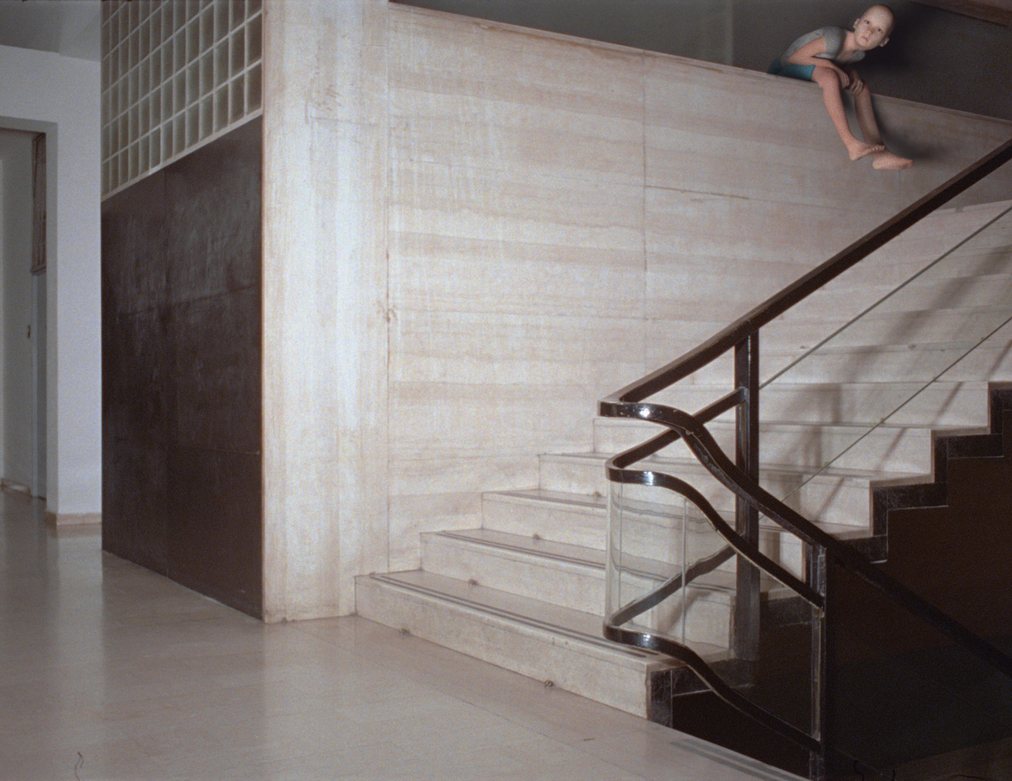 This contrast of human and CGI is, for Marcon, an important element of the work because it allows for the creation of ambiguous and opaque images. The CGI figures are like ghosts, presences that are stuck between two opposing states, almost transcending the physical environment in which they appear, while the girls are resolutely tethered to the Casa del Fascio, intimately bound by touch, by their bodies propped against the building’s interior, unable to escape.
