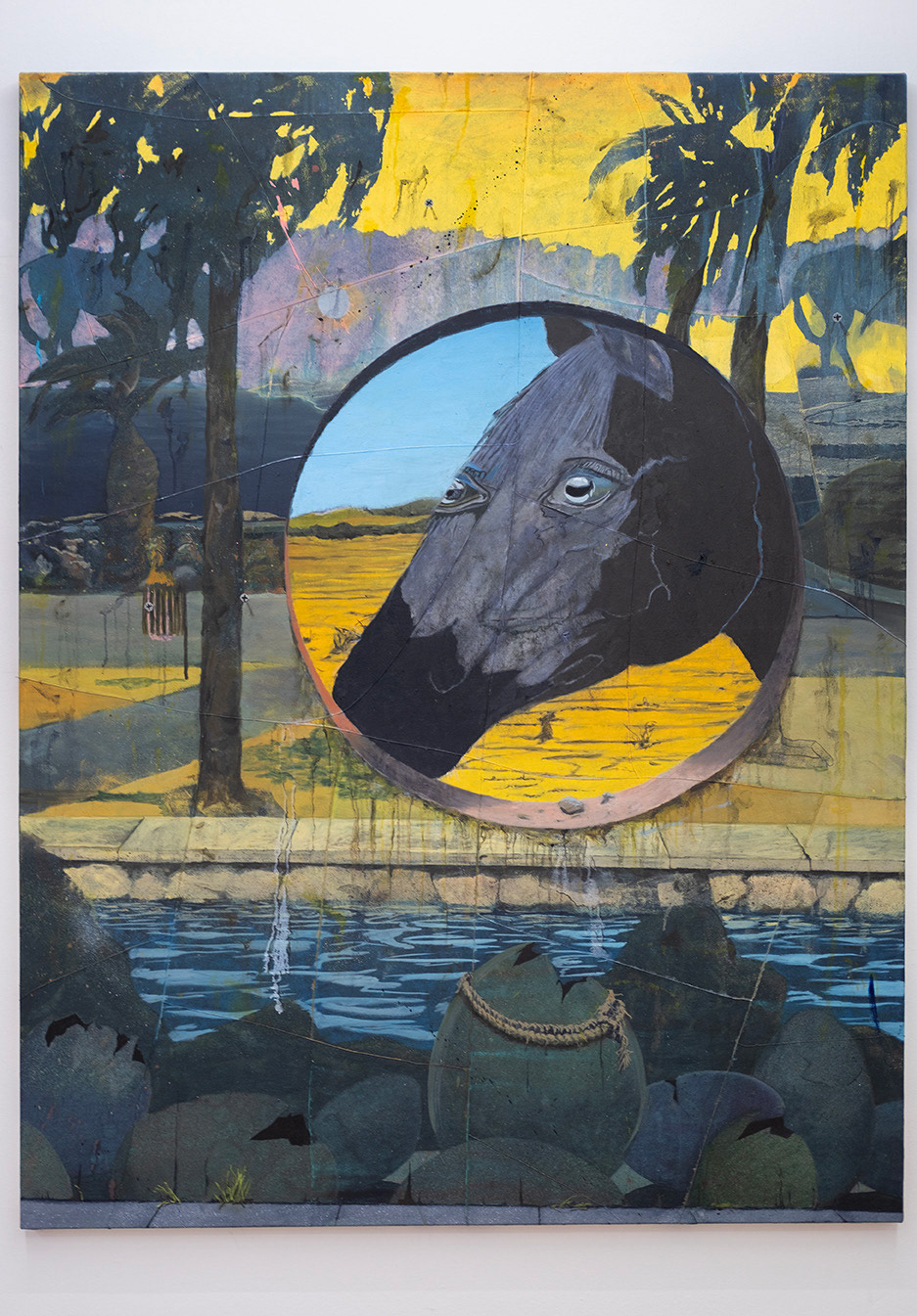 The vast breadth and depth of Los Angeles’ valleys is compressed in Olivia Hill’s birdseye view showing no life but only traces of tyres doughnutting the dirt. Sandcastles recur as a motif, perhaps childish recollection, perhaps comment upon the instability of California - whether that’s geology, culture, or economy. A mock-castle looms over a collapsed green bungalow in Glendale, itself collapsing into the landsliding sand. California, Hill’s subject area, is rich with context, fakery, imagination, and limitless possibilities, but the artist instead forms tight frames, careful compositions of place which speak carefully through extracted detail.