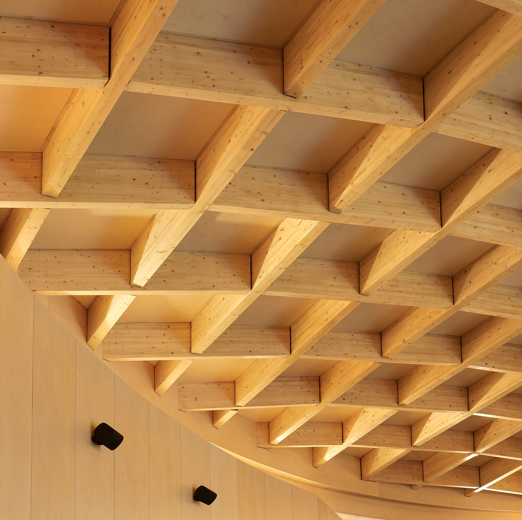 A key element of this are tall timber doors which louvre open to reveal a view towards a rose garden, but which also act as sonic reflectors. The diagrid roof shows its structural form as a design feature, while also performing acoustically to allow sound to bounce around and support a larger sound with fewer echoes – all tested by the London Philharmonic orchestra at the opening ceremony.