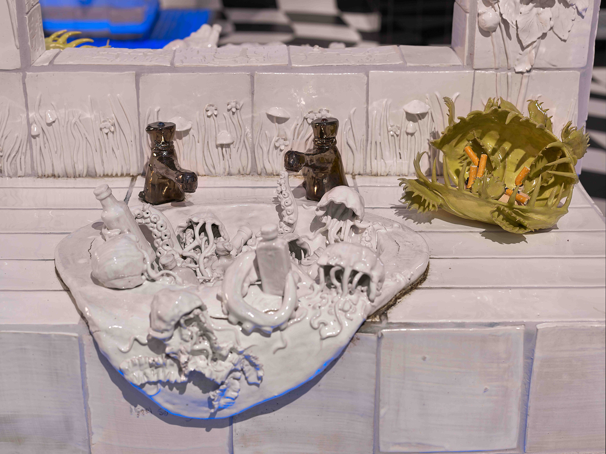Lindsey Mendick (b.1987, London) lives and works in Margate. Mendick received an MA in Sculpture from the Royal College of Art, London in 2017. Mendick works predominantly with clay, a medium that is often associated with decoration & the domestic, subverting these historic connotations to create skilled monuments to ‘low culture’ & the contemporary female experience. Often culminating in elaborate installations, Mendick’s autobiographical work offers a form of catharsis, encouraging the viewer to explore their own personal history through the revisionist lens of the artist. Her work challenges the male gaze, promoting instead an unapologetic, humorous &, at times, grotesque femininity. She was the recipient of the Henry Moore Foundation Artist Award in 2020, the Alexandra Reinhardt Memorial Award in 2018 & was also selected for Jerwood Survey 2019 & the Future Generations Art Prize 2020. Recent solo & two-person exhibitions include: Goldsmiths CCA, London; Cooke Latham, London; Eastside Projects, Birmingham; Space, Ilford; Castor Projects, London; Hannah Barry Gallery, London; The Turnpike, Leigh; Zabludowicz Collection, London; Vitrine, Basel; Visual Arts Center, Austin, Texas; Oriel Wrexham, Wales; STCFTHOTS, Leeds & One Thoresby Street, Nottingham. She has previously been commissioned to make new projects that included ceramic workshops at Kunstraum, London; The Turnpike Pottery, Leigh & for the Cheltenham Council. She is represented by Carl Freedman Gallery, Margate.