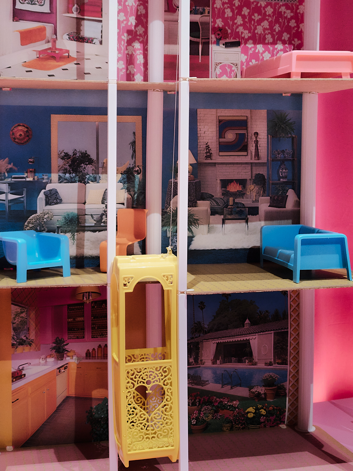 Elsewhere, we get to explore Barbie’s history of collecting classic design furniture. Chintzy and florally decorated beds, chairs, and tables from the 1980’s interest in traditional interior design can be seen in proximity to her 1998 Trendy Loft fitout, replete with inflatable chair, futon sofa, and lava lamp. There is a collaboration with Kartell with five of the company’s seminal Philippe Starck chairs remade at her scale in a shocking pink.
