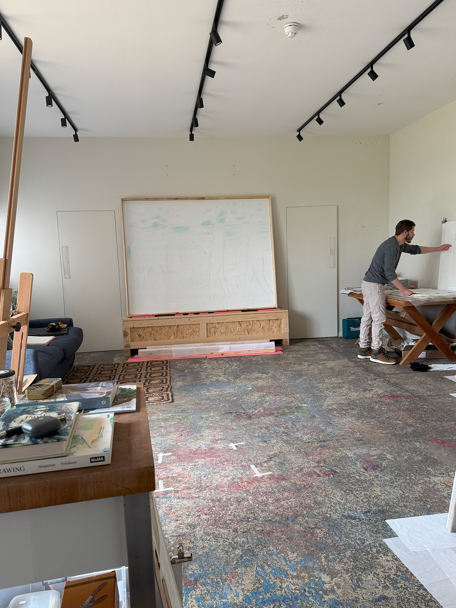 This is epitomised by one of the artists on my visit, the painter Zoë Carlon whose oil-based works interrogate quotidian moments of “active attention”. She defines active attention as what uses up our immediate consciousness, such as social media’s algorithmic ability to keep us on the app. During her residency, Zoë has turned from oil painting to charcoal drawing, reconnecting with mark-making and form to better understand her subject matter.