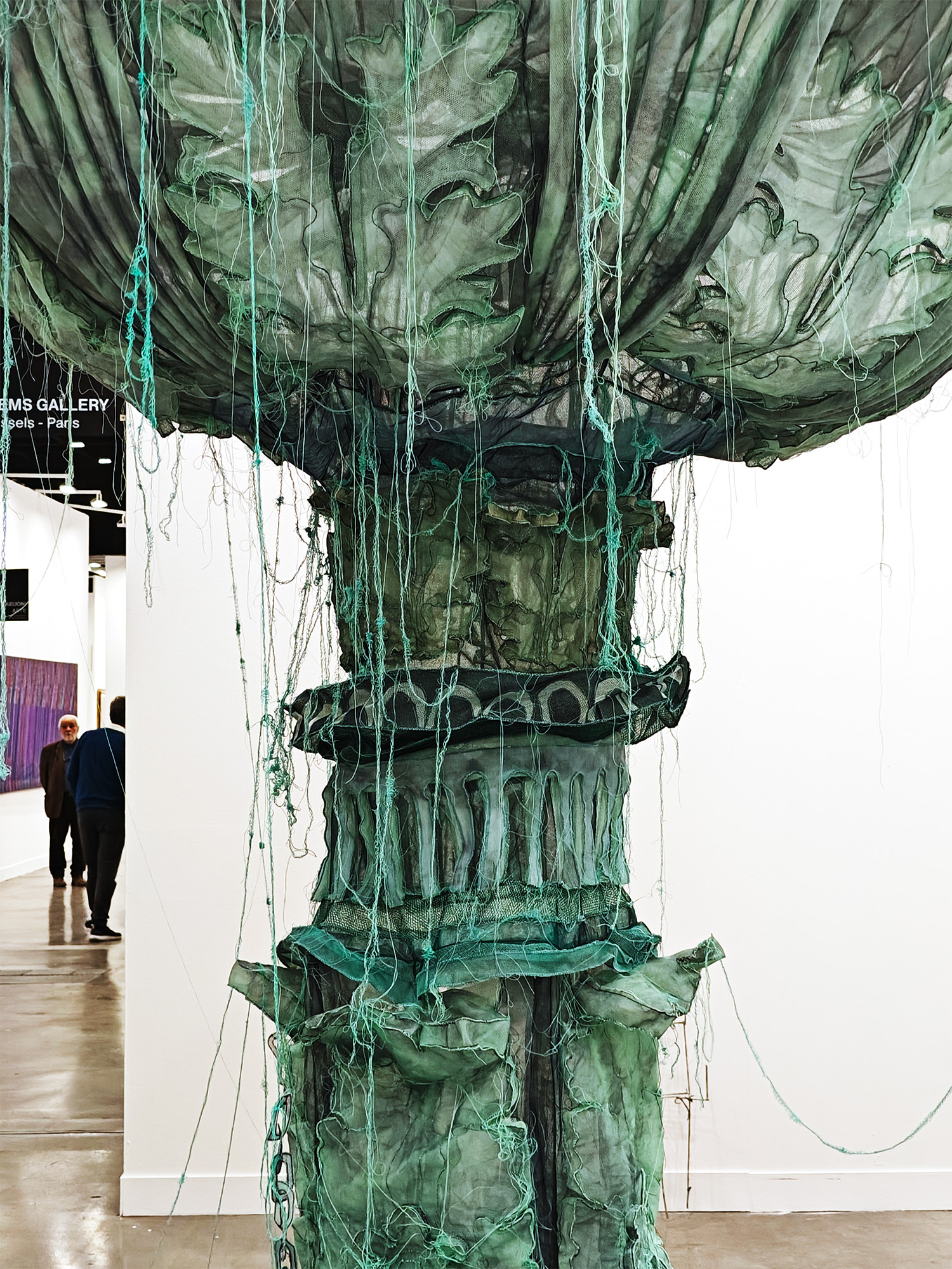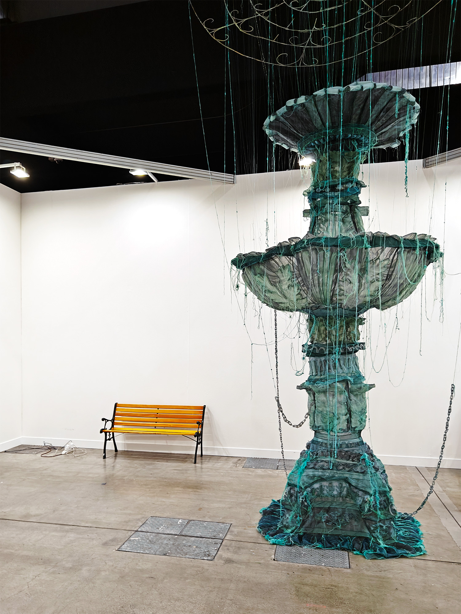 A standard public bench and trace of ironwork railings push against the Miart space walls, offering subtle context. Up close, the stitching reveals itself to be a chaotic mesh of strands almost as loose and free as the water circulating within the actual fountain.