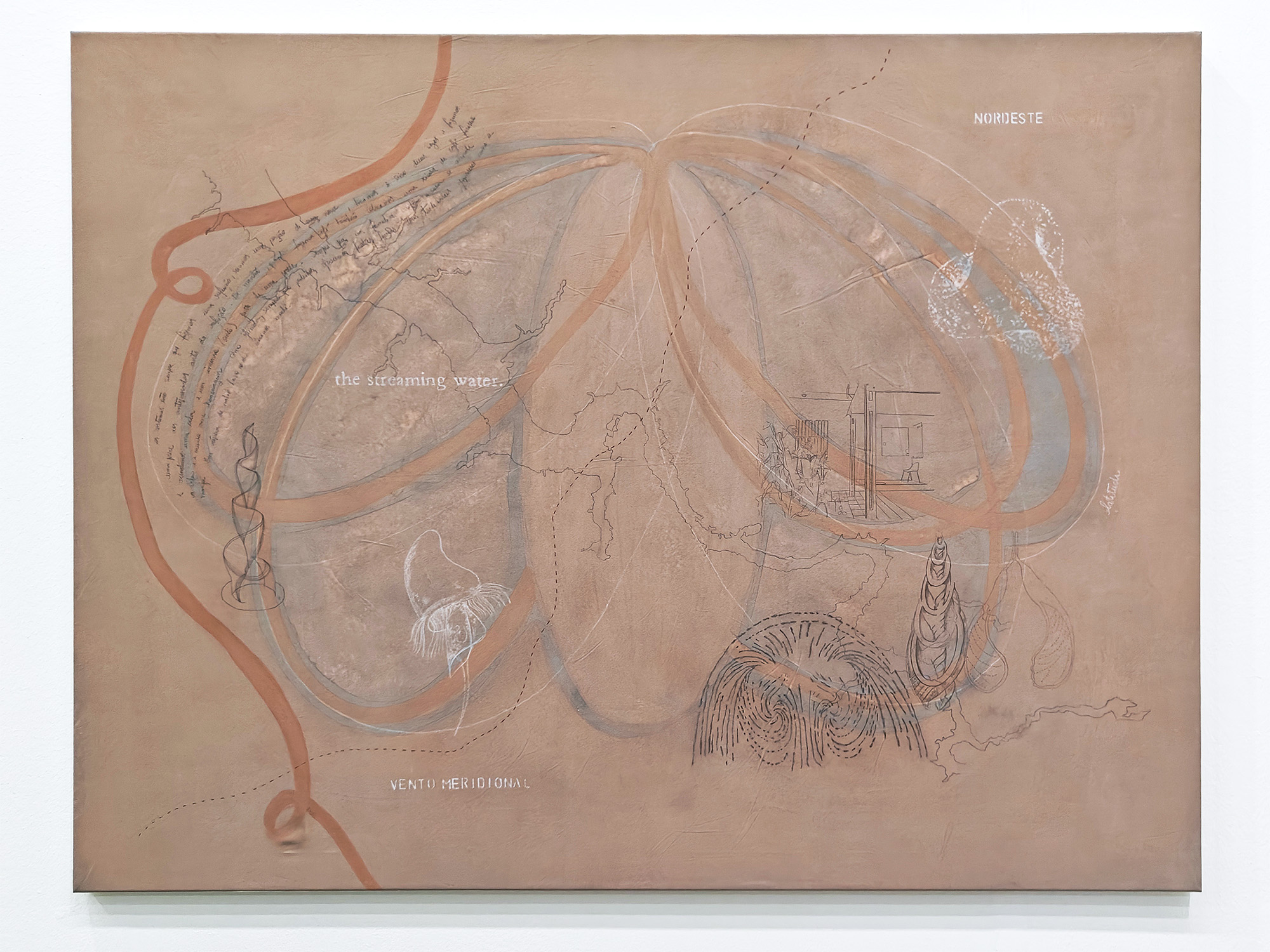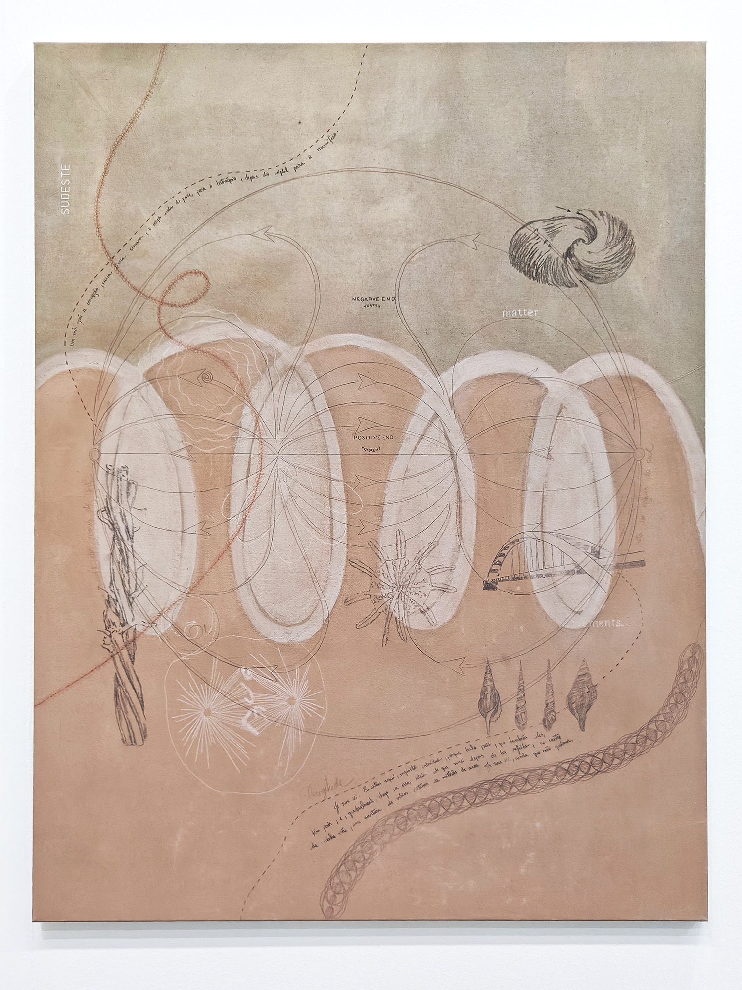 The work from two Brazilian artists, Juliana Matsumura and Flavia Regaldo, pair extremely well, both marrying tonally and thematically in their subtle reflections on land and natural material. Regaldo’s etchings read as natural systems, but with a withheld scale – these could be biological, atmospheric, or landscape. Matsumura also plays with forces and systems in collages of clay, plaster, and image transfer that are titled after riparian routes, relating perhaps to colonial movement as well as natural. On the floor, a clay checkerboard of material transformation and decay using many of the artist’s processes and materials.