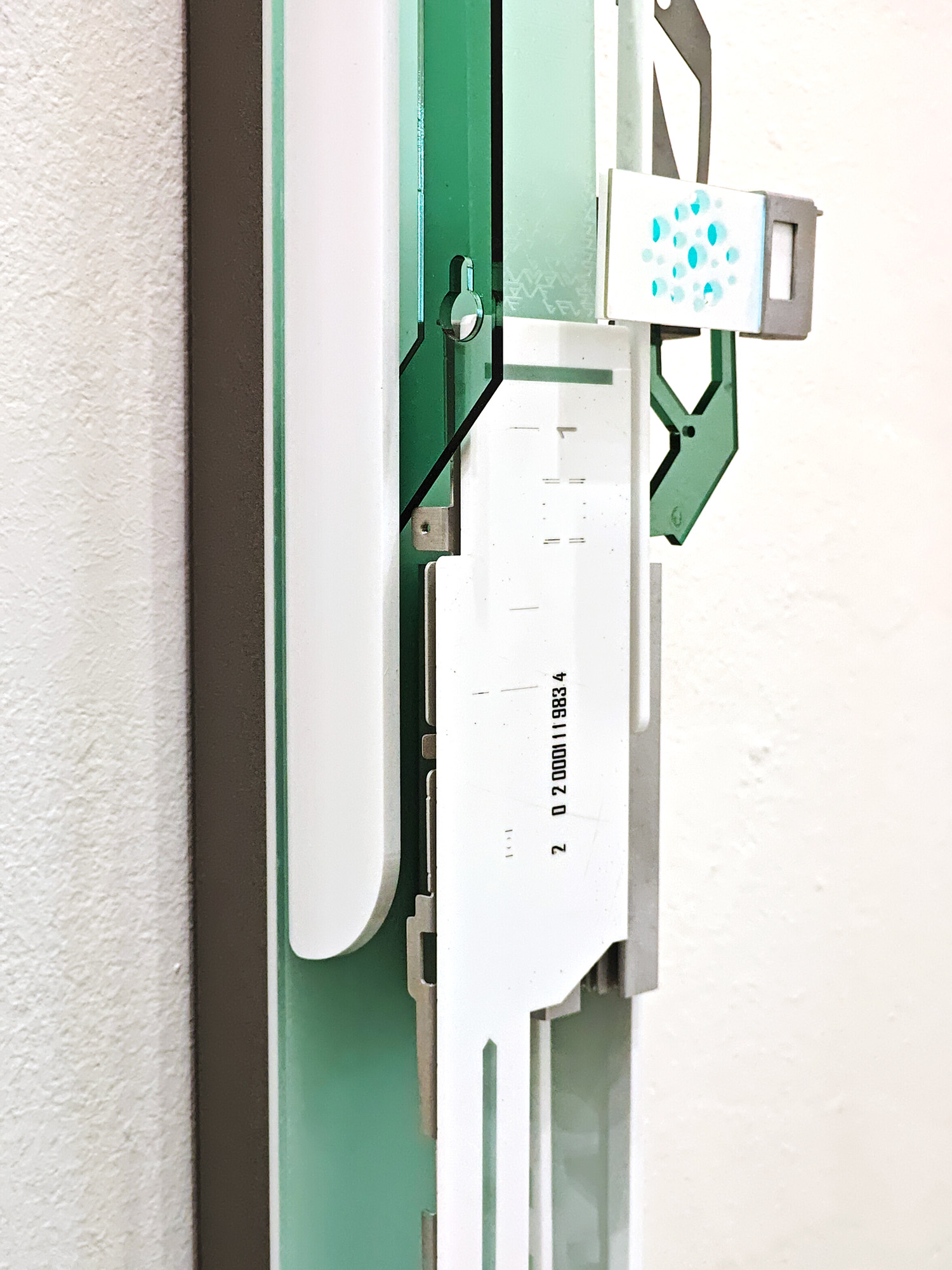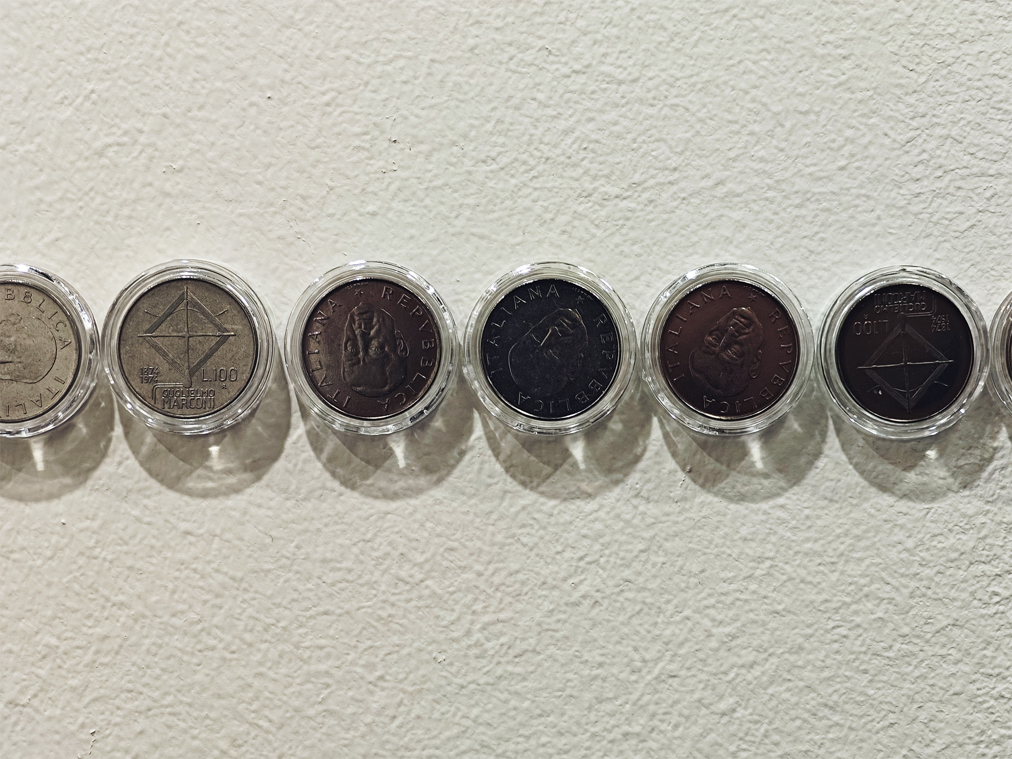 For Shahin Zarinbal gallery, Sanna Helena Berger‘s furniture sculptures repurpose IKEA systems into poetic discussions on material, time, and measurement. What looks at first like a badly put together shelving unit is actually a manipulated and transmogrified construction composed of not only one set of IKEA shelves, but different iterations of the unit going back through the design store’s life. As such, shelves carry their age in detail and decolourisation, acting as strata measuring a period of mass international capitalism. A single line acts as a datum, measuring the art work standard hanging height of 1m55. The line is formed of Italian Lira, the national currency before the European project. Here, the coins are locked into a strict, unwavering geometric line, counter to their life when currency, the Italian lira undergoing rapid inflation over the fascist period of the 20th century, with 2000 lire equating to around €1 by the time of the introduction of the Euro in 1999.