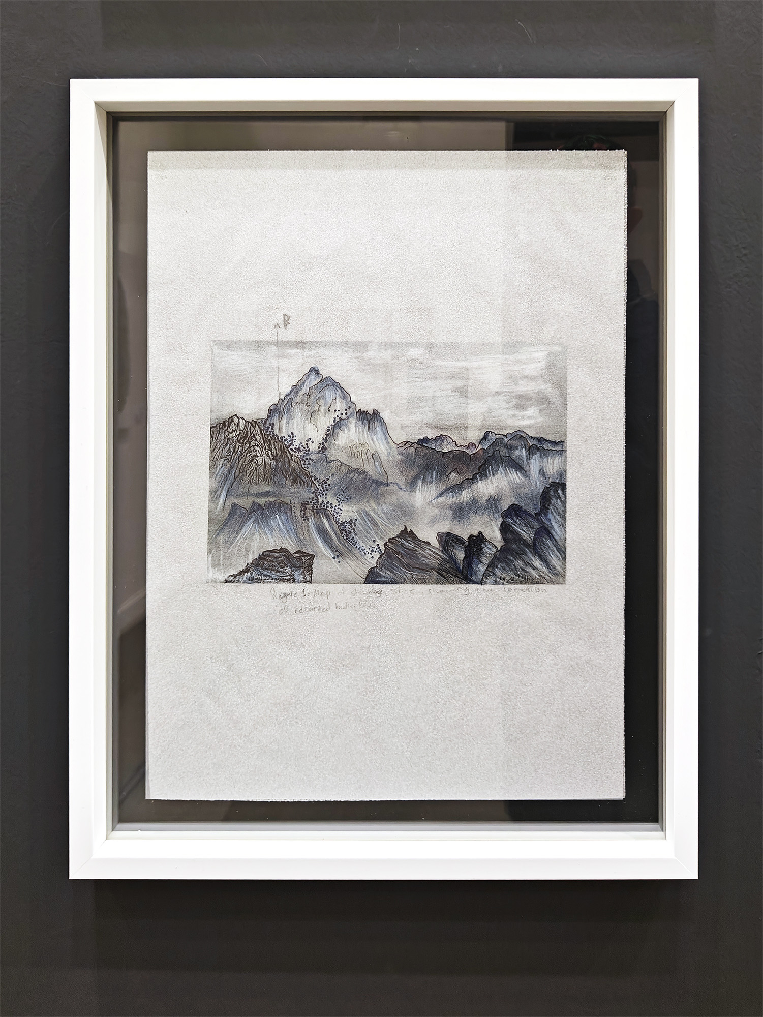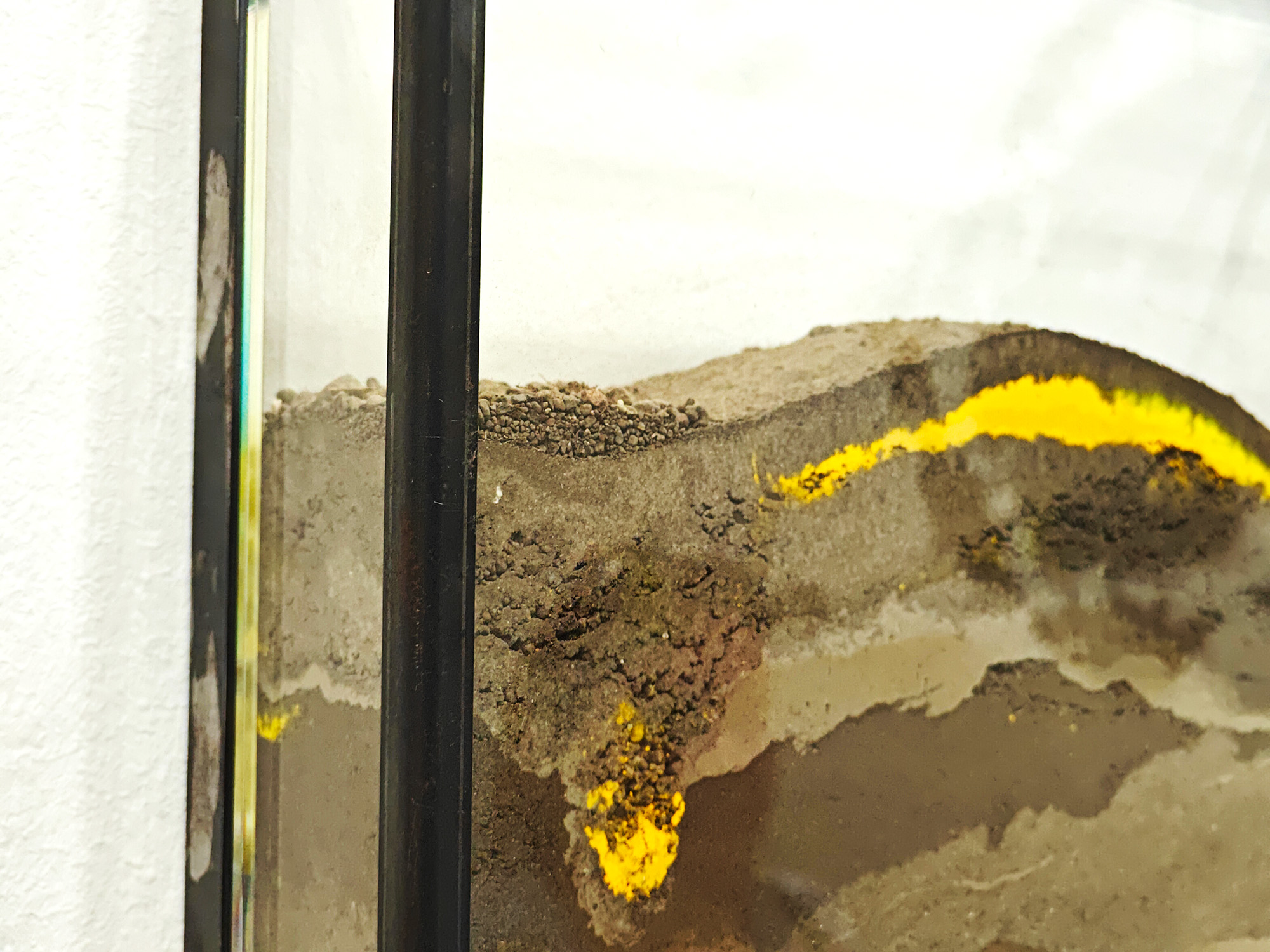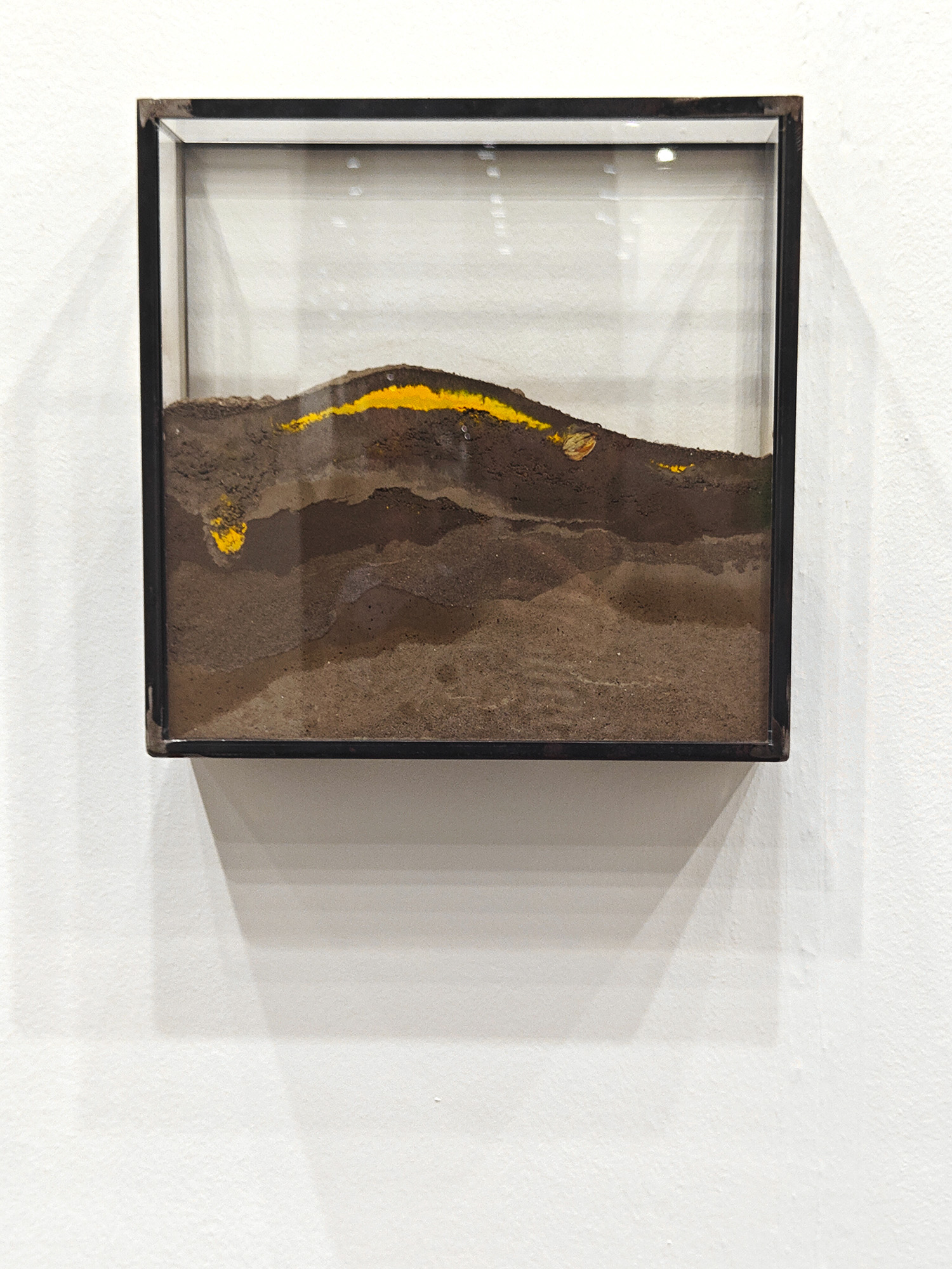 Featuring one of Miart’s most fragile works on show, Galleria Paola Verrengia’s booth has several artists that speak to ideas of landscape and how we occupy it. Maria Elisabetta Novello’s glass-boxes are containers of earth and matter from a single landscape, here reformed as a specimen into a delicate layering that could all mix and lose its form with a shake or drop. Novello is another artist we have featured from the annual Italics art festival, her work featuring in 2024’s edition from Monferrato (see 00235).