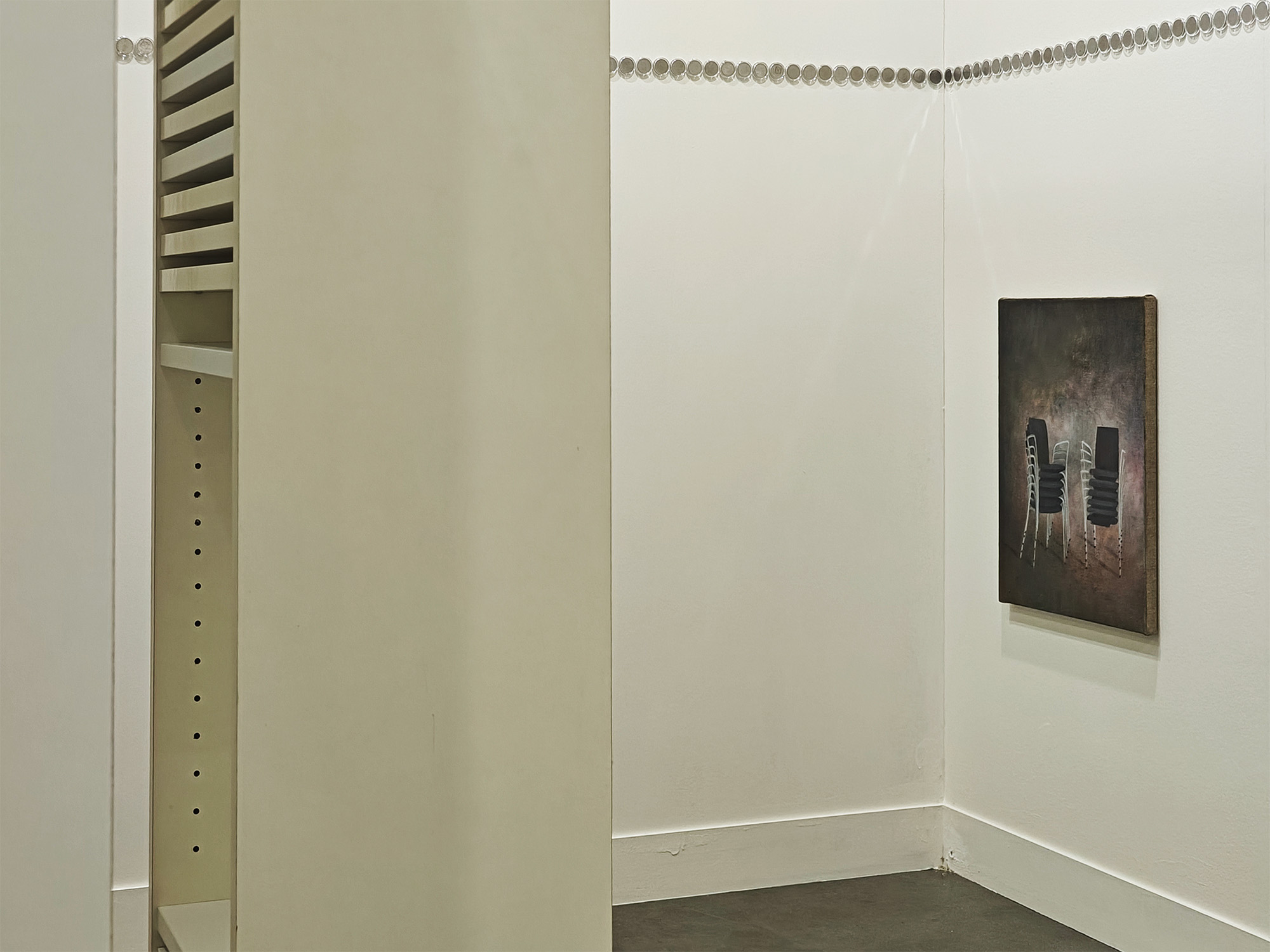 Represented by Matteo Cantarella gallery, Cecilie Norgaard sets against these stark, conceptual works with tempera and oil paintings with similar rhythm, order and capitalist logic. Images of stacked chairs standing as sculptures, mirroring the furniture, similarly speak to design and systems, albeit unused and left as totemic towers.