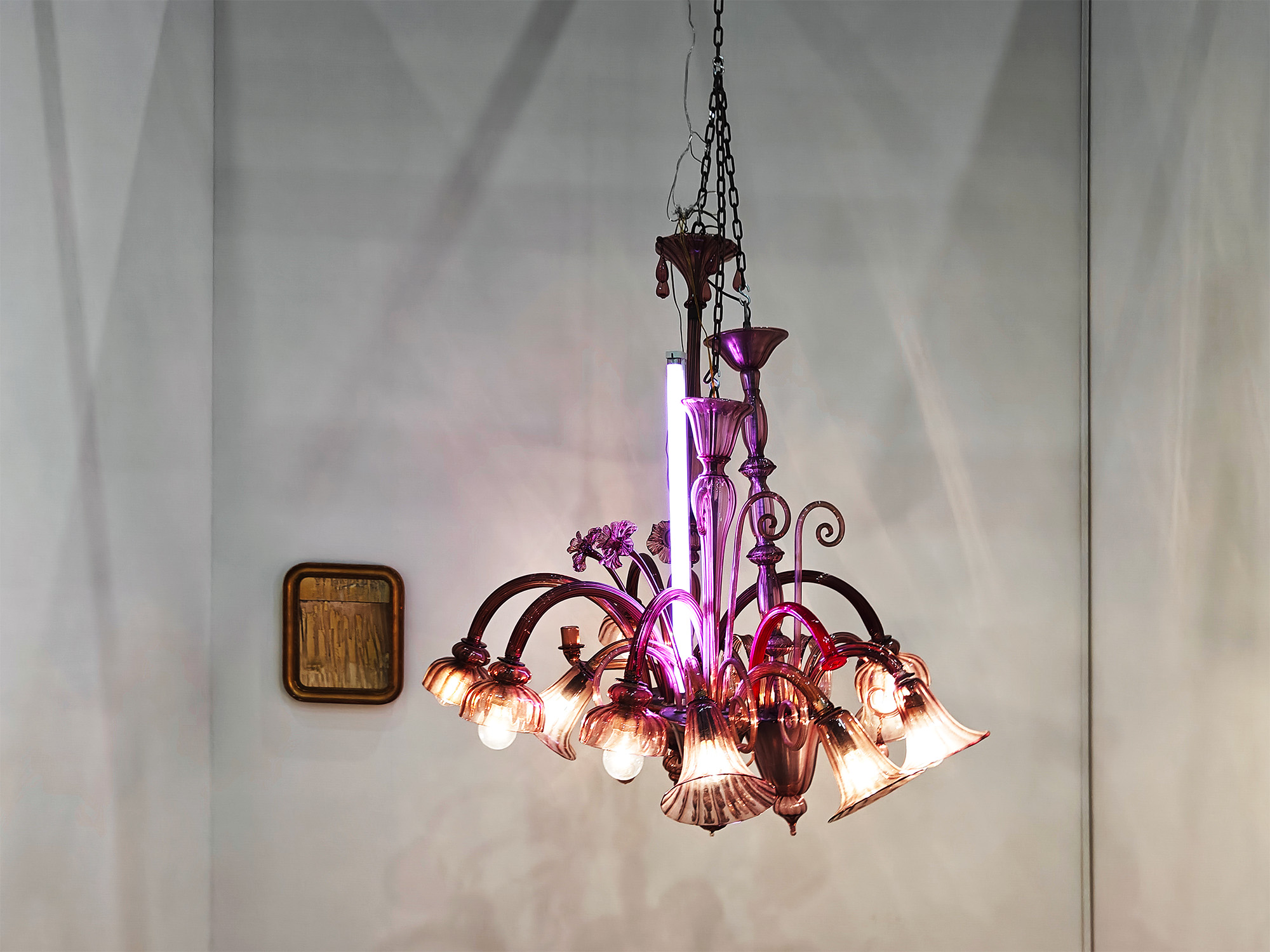 In a somewhat-domestic corner, Flavio Favelli hangs a Frankenstein chandelier, an assemblage of Murano glass spanning different eras of Italian design. Behind, on the wall, a framed and scratched mirror, the artist creating the work within the object itself, and with it disrupting how we look at surface, art, and ourself.