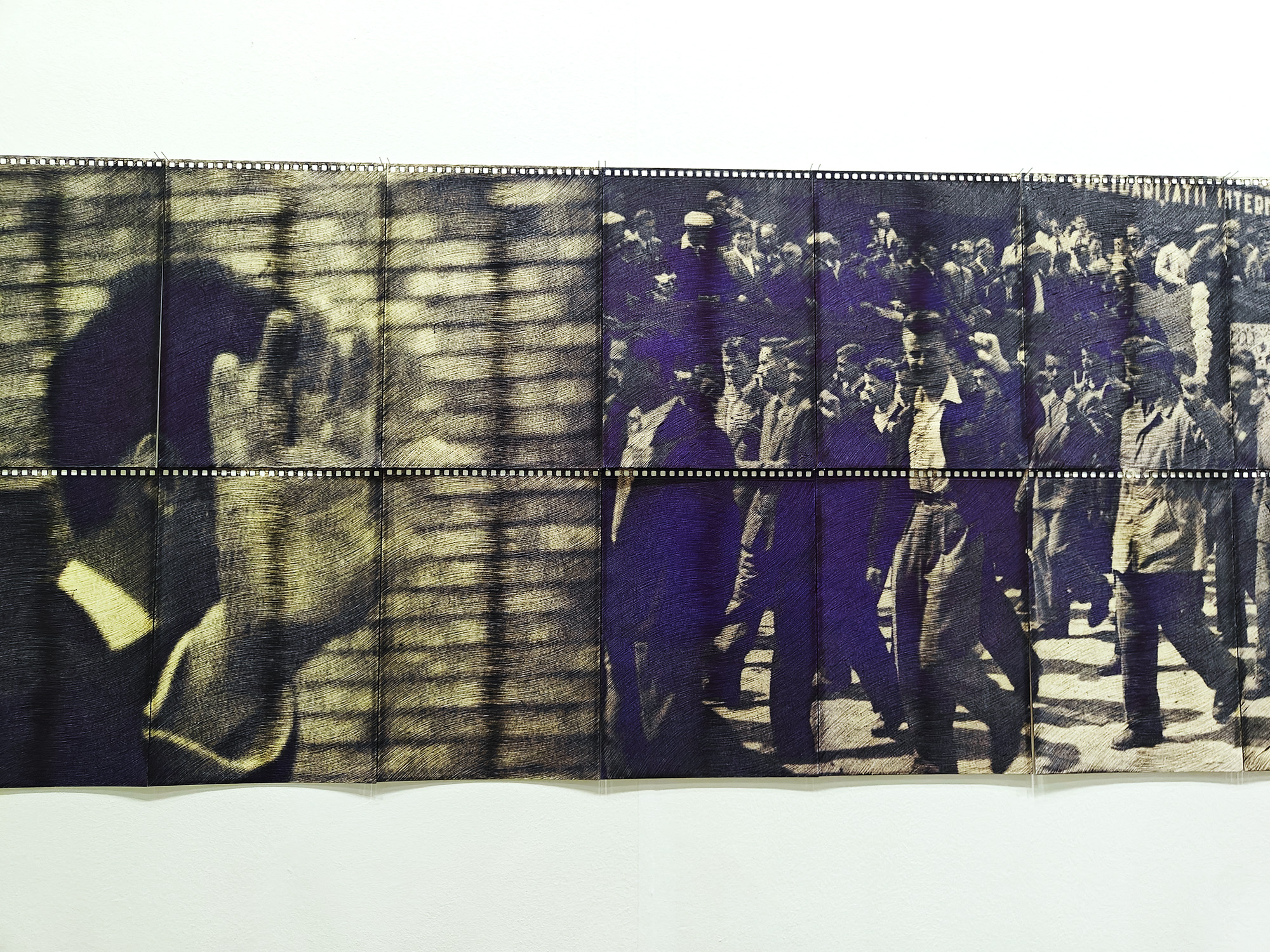 Răzvan Anton’s work is slow in the making, but through it captures haunting histories and brings life and time to singular, passing moments. His technique involves covering paper sheets in biro, gridding them then layering over a transparent screen with a found image – then leaving it all in the window of his studio to slowly expose in the passing sun over months. The images in Anton’s work here show the artist’s father in the 1970s and 80s, on a May Day procession, capturing a personal and social moment from Romania’s communist past.