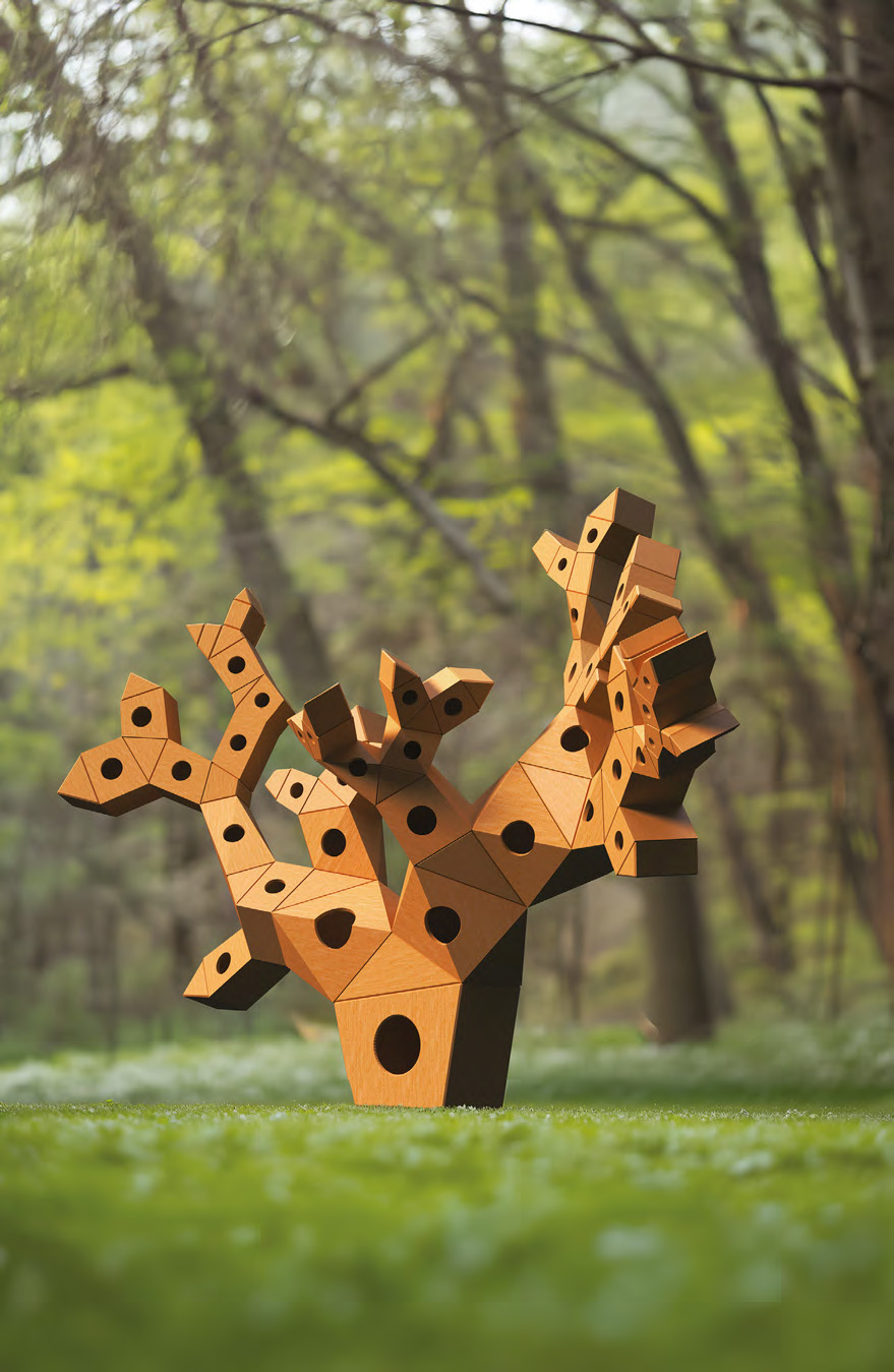 Sou Fujimoto, fresh from designing the 61,000 square metre Grand Ring at the Osaka Expo 2025, here designs a project also of wood though somewhat smaller. Perhaps inspired by the urban sculptures by fellow Japanese creative Isamu Noguchi (00020), Fujimoto has created a tessellated tree of connected hollow forms. Each can hold water, seeds, or feed, with the overtly sculptural form intended to dialogue with nature and user over time and provide whatever is needed in any environment.