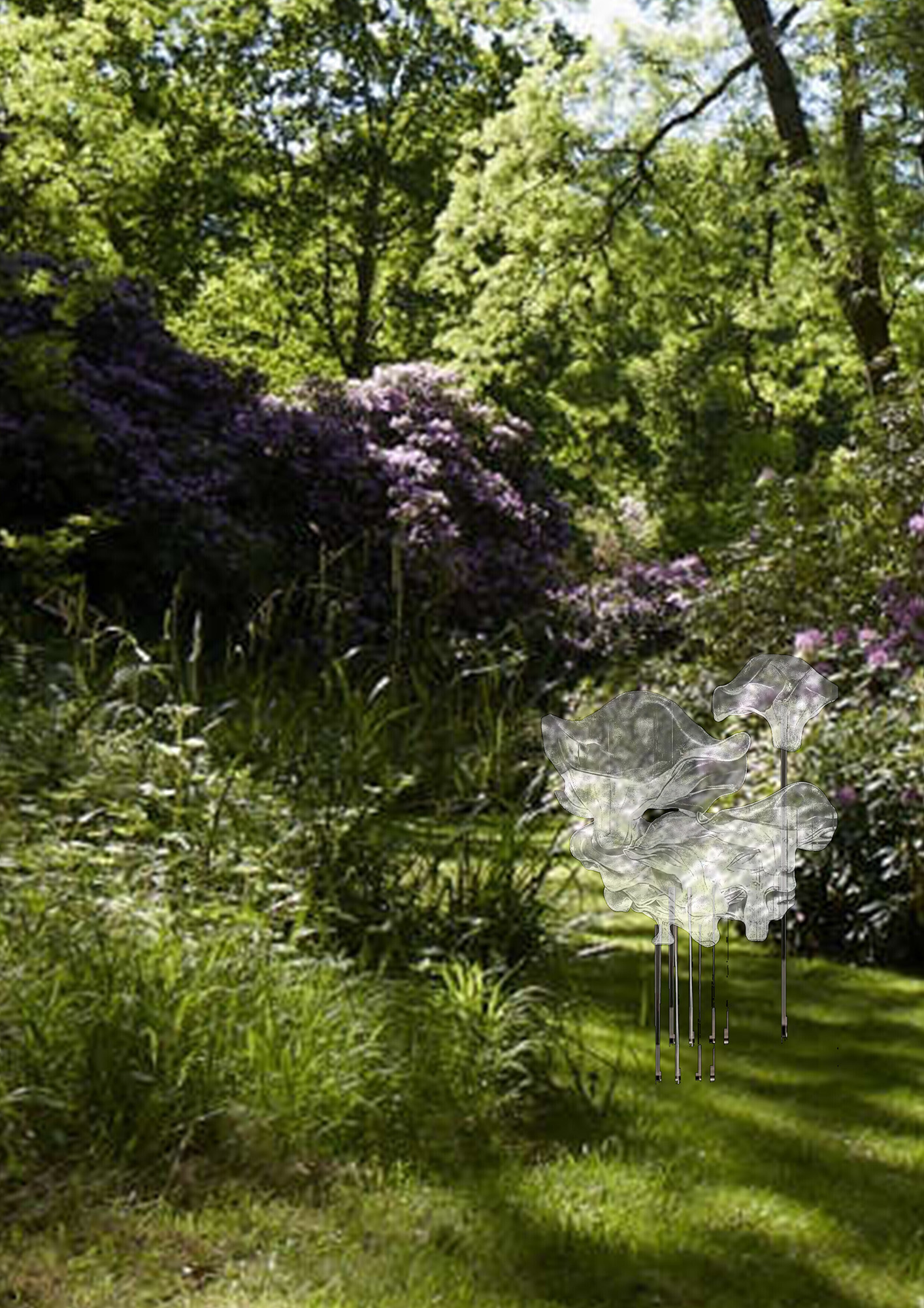 Also using wood, Frida Escobedo takes a decidedly minimal approach with a framework scaled to suit common birds of London including magpies, pigeons, tits, and blackbirds. In contrast, Lina Gotmeh goes full bird-Baroque with a swirling blown-glass design, drawing inspiration from floral nature and just a delicate, fragile, and precarious.