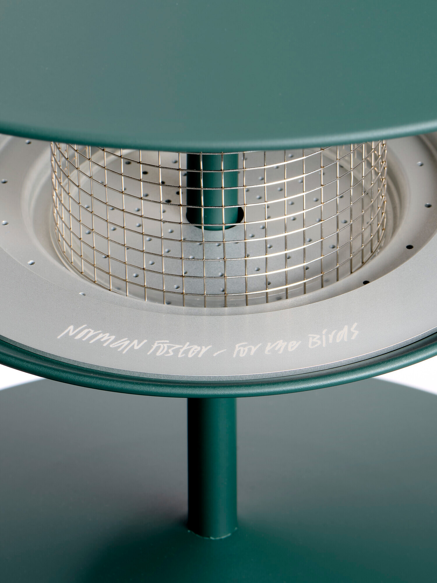 Foster’s own design comprises two pieces of bird architecture, a series of four spun aluminium cones suspended on tubes for feeding and a standing column holding another cone as a bird bath. The typical Foster-esque neatness, practicality, smoothness, and engineered detail (00101) is there, while the matte green finish is designed to sink it into any surrounding nature.