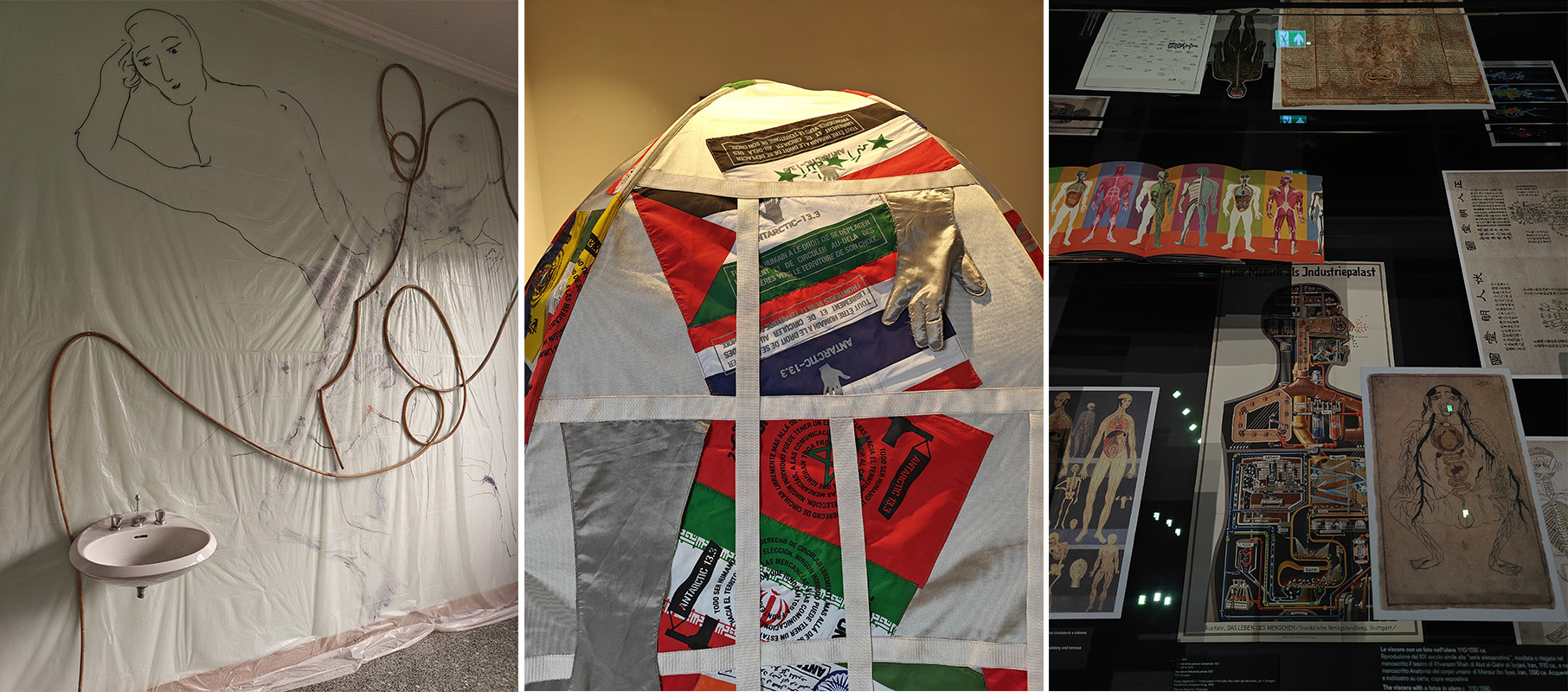 The Potential Architecture of Lucy and Jorge Orta is shown at the SPARC* Venice Art Academy – but only as an exhibition slightly overlapping with Biennale, so you’ll need to be quick to see it before it ends on 16 May. If you do get there, you’re in for a treat with several of English artist Lucy Orta’s celebrated architectural-clothing drawings that speak to the body, migration, climate, and survival. Central to the presentation is one of their Antarctica Dome Dwelling tents, a tent for an apolitical, unowned, unspoilt place made of flags from those at risk, attacked, who are now refugees, or are suffering. Shelter is further explored in a series of drawings, models, and glass-blown sculptures that speak to the idea of a growing cell, expanding upon existing buildings to create spaces of security and living.