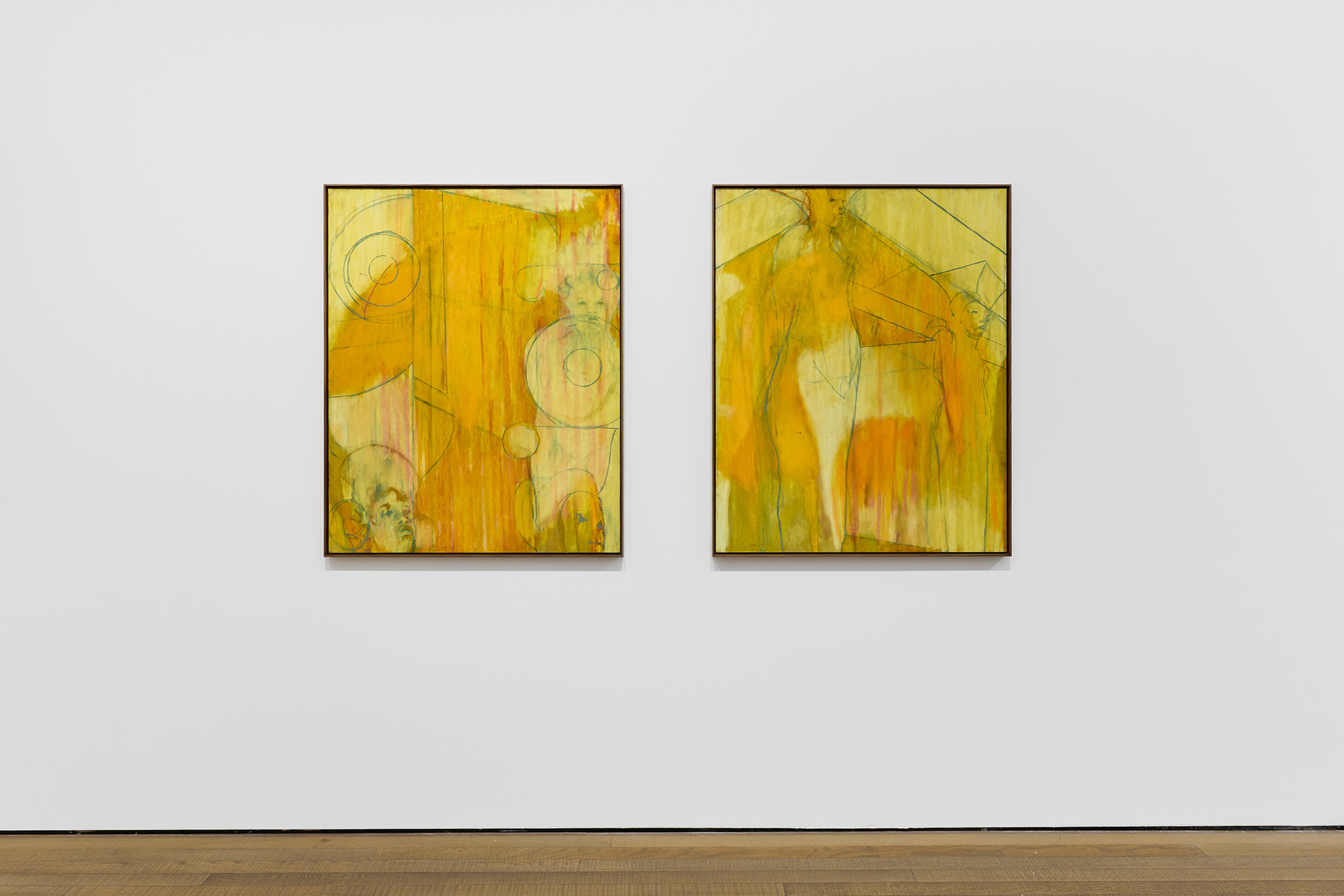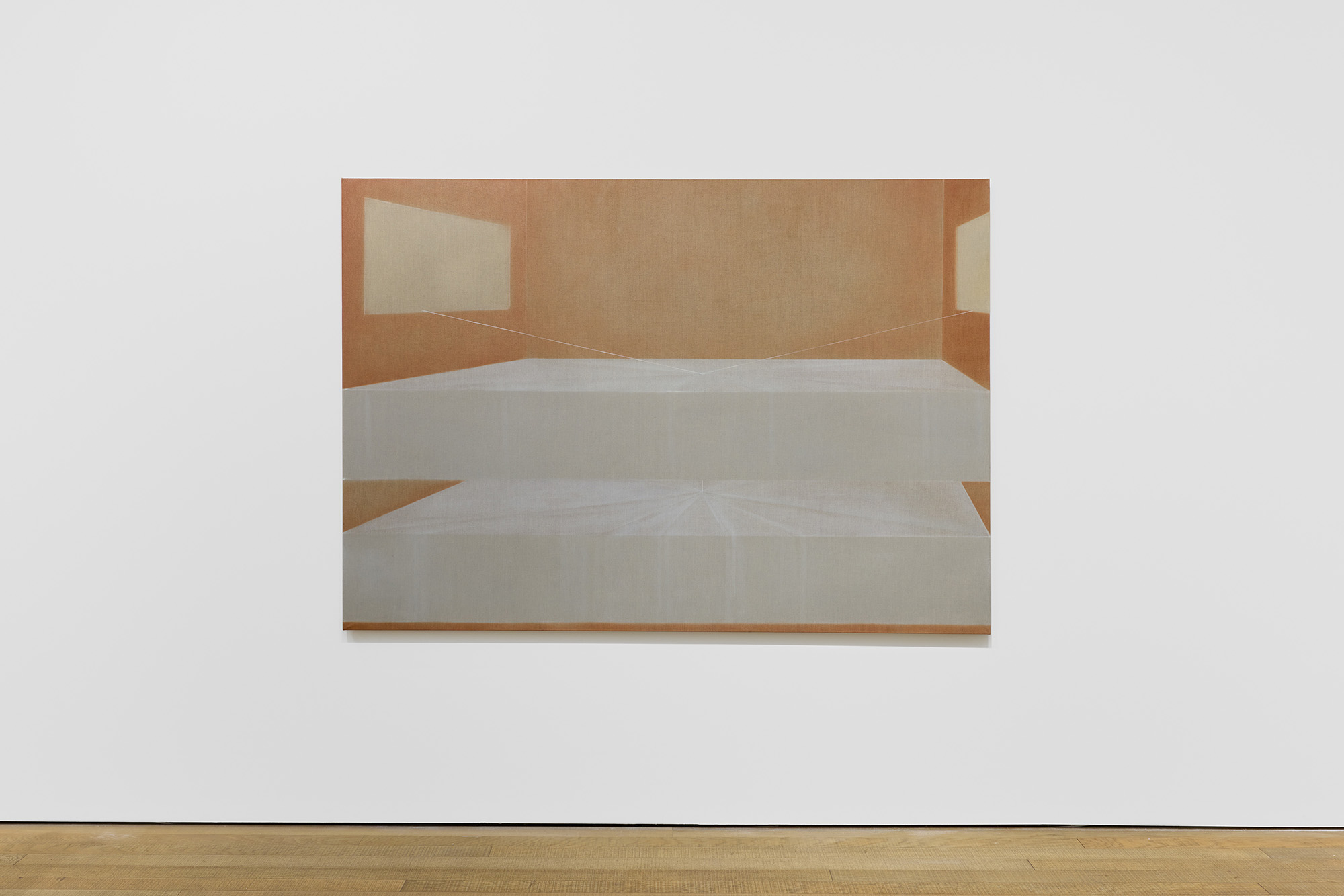 A key concept of the exhibition is the idea of the house as a self-portrait.[3] In Soane’s text, the artefacts and interiors give the narrator clues about who might inhabit such a house. This can also be seen in Christina Kimeze’s paintings Caryatid (I) and Caryatid (II) (both 2025), for example. Each depict close-ups of architectural fragments in yellow hues. The caryatids of the title, which are rooted in the frame of the paintings as focal points, suggest a temple (just as in Soane’s text) even while the spaces they occupy are hazy and mutable, making it difficult to discern exactly the type of building being shown. In Mary Stephenson’s works Two In The Pink Room and Blue Portion (both 2025) we see sparse modernist interiors rendered in clean lines and muted tones, perhaps revealing the home of an architect, a character that also appears in Soane’s text as a resident of the house.