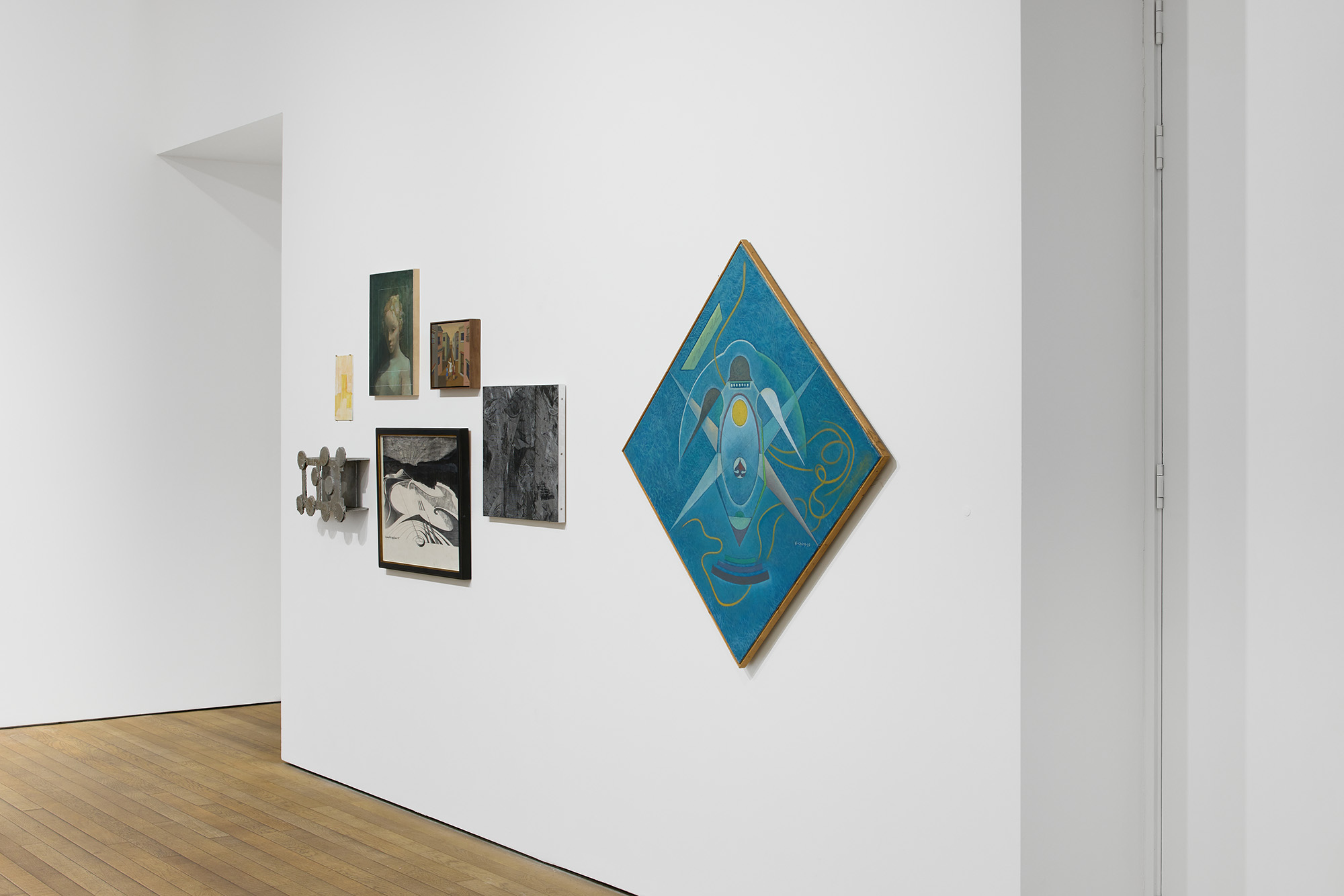 Soane’s house-museum brings together an eclectic mix of objects, artefacts and curiosities relating to magic, esotericism and religion. In Crude Hints (Towards) we can see this interest in religion and magic in various works, including Shigeo Otake’s painting The Crossroads of the Six Realms (2024) which depicts three girls standing at the centre of a crossroads with six pathways leading in different directions. These pathways represent the six possible routes to rebirth in Buddhism (heaven, human, animal, fighting demon, hungry ghost and hell), which is determined by how much karma a person accumulates during their lifetime. Alexandru Chira creates abstract paintings, reminiscent of Hilma af Klint’s spiritualist paintings, that are heavy with cosmological symbolism derived from the quasi-magical system that Chira devoted his life to developing.[5]