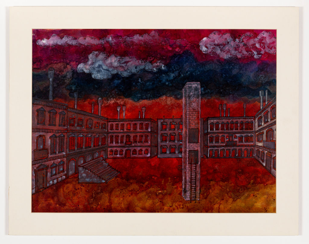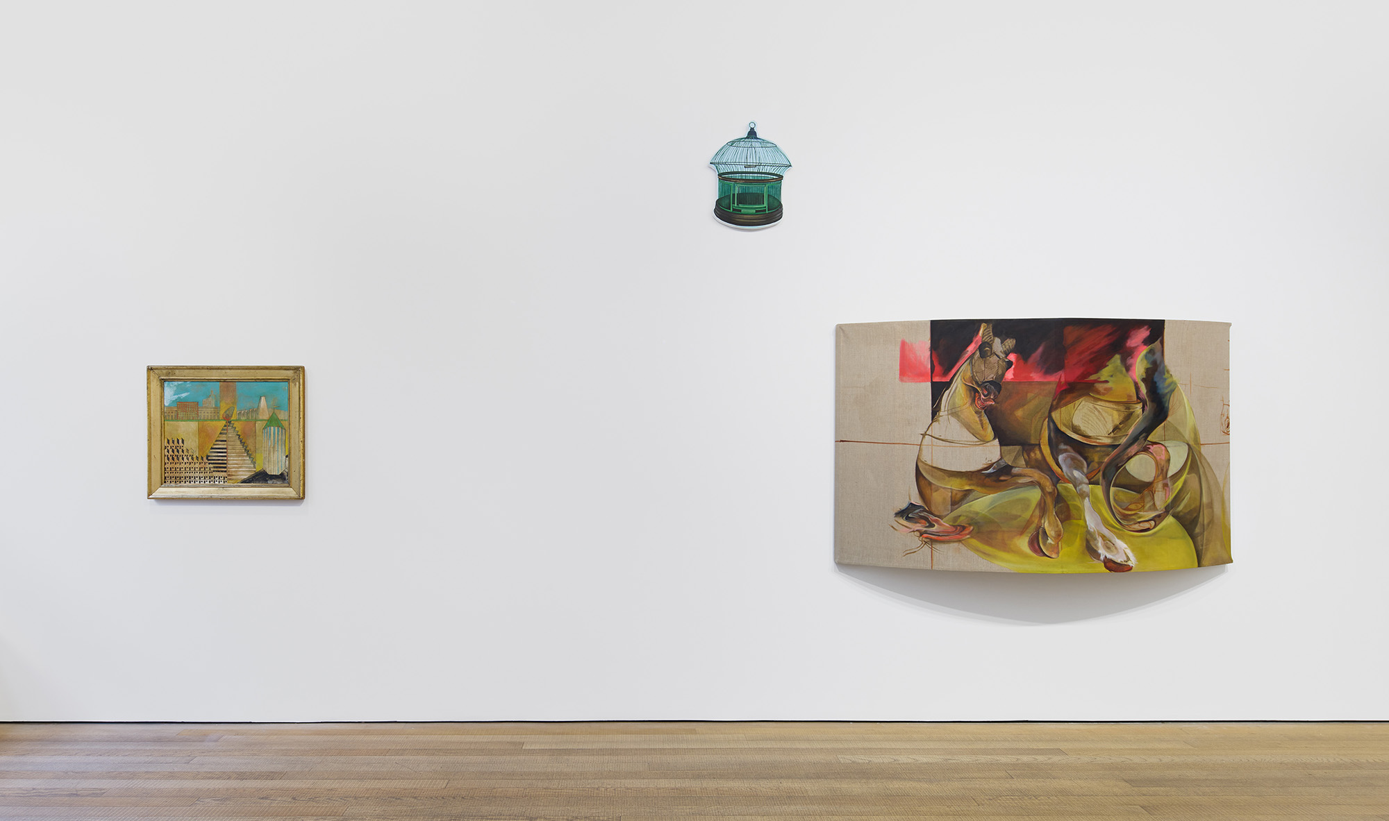 Aldo Rossi’s Geometrica della memoria (Geometry of Memory, 1978) is part of a series of paintings he made based on fragments of architecture which he assembled into one image to create new, imagined cityscapes. Similarly, Gabrielė Adomaitytė collages imagery together to form complex, multilayered scenes that play with space and perspective. In her painting Grey Made Grey (2025) we look up at a building with a window and balcony through a haze of watery blues and blacks that obscure and obstruct our view and gives the sense of observing through a reflection in a puddle. Longer looking reveals that we appear to be seeing the window through both the interior and exterior of a car, the differing perspectives superimposed on each other. Both Rossi and Adomaitytė’s works speak to the fragmentary nature of Soane’s house, but also, interestingly, through their reimagining of scenes and structures that are rooted in reality, they are also drawing links between Soane’s fictionalisation of his home and the real one that he was in the process of creating.