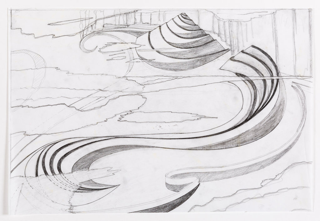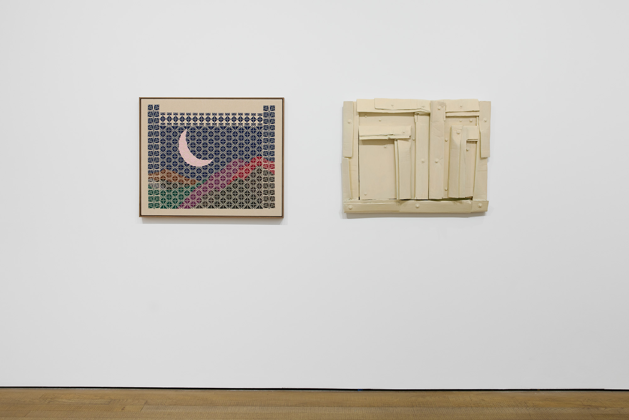 Charlotte Edey’s Axis Drift (2025) uses stained glass and soft pastel on paper to create a window that acts like portal into another realm. We peer through a glittering glass to see a fragmented view behind – large, draped fabrics like curving waves with what could be the horizon behind. The piece is made up entirely of curving and diagonal lines which gives the work tension, a feeling of being off balanced (in fact, many of the works in the show rely on the interplay between curved and straight lines, such as in Charles Jencks’ two plans for the Garden of Cosmic Speculation (c. 1992–3 and 1995) with the spiral mound in opposition to the straight lines of cosmic orientations). Jordan Nassar’s work To Those Who Keep Waiting (2025), on the other hand, adapts the tradition of Palestinian tatreez (cross stitch) which is associated with cushions and other domestic items to create a landscape of colourful mountains, a large moon hanging in the sky.