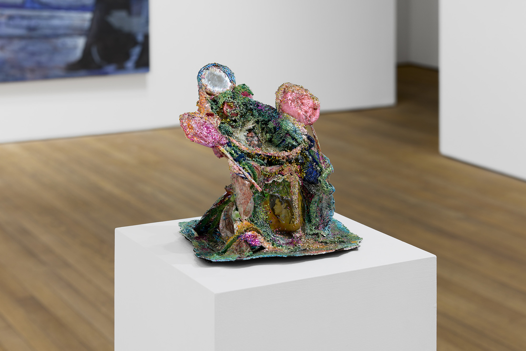 Machteld Rullens’ two works Crème Barn and Crushed Agnes on a Trip (both 2025) are made from found cardboard and epoxy resin. By flattening the boxes and painting them, fixing them in place (again, like Soane’s necromancer into marble) Rullens brings them out of their original context as functional objects into the sphere of painting (and you can see the influence of, for instance, the painter Agnes Martin in Crushed Agnes on a Trip). Julien Monnerie does a similar thing with his sculpture Asparagus (2025) made from silver-plated pewter. In this piece, Monnerie playfully reinterprets the medium of pewter – often used for making tableware such as cutlery – to create a holder for an asparagus, the very thing you might use a pewter item to eat it with.