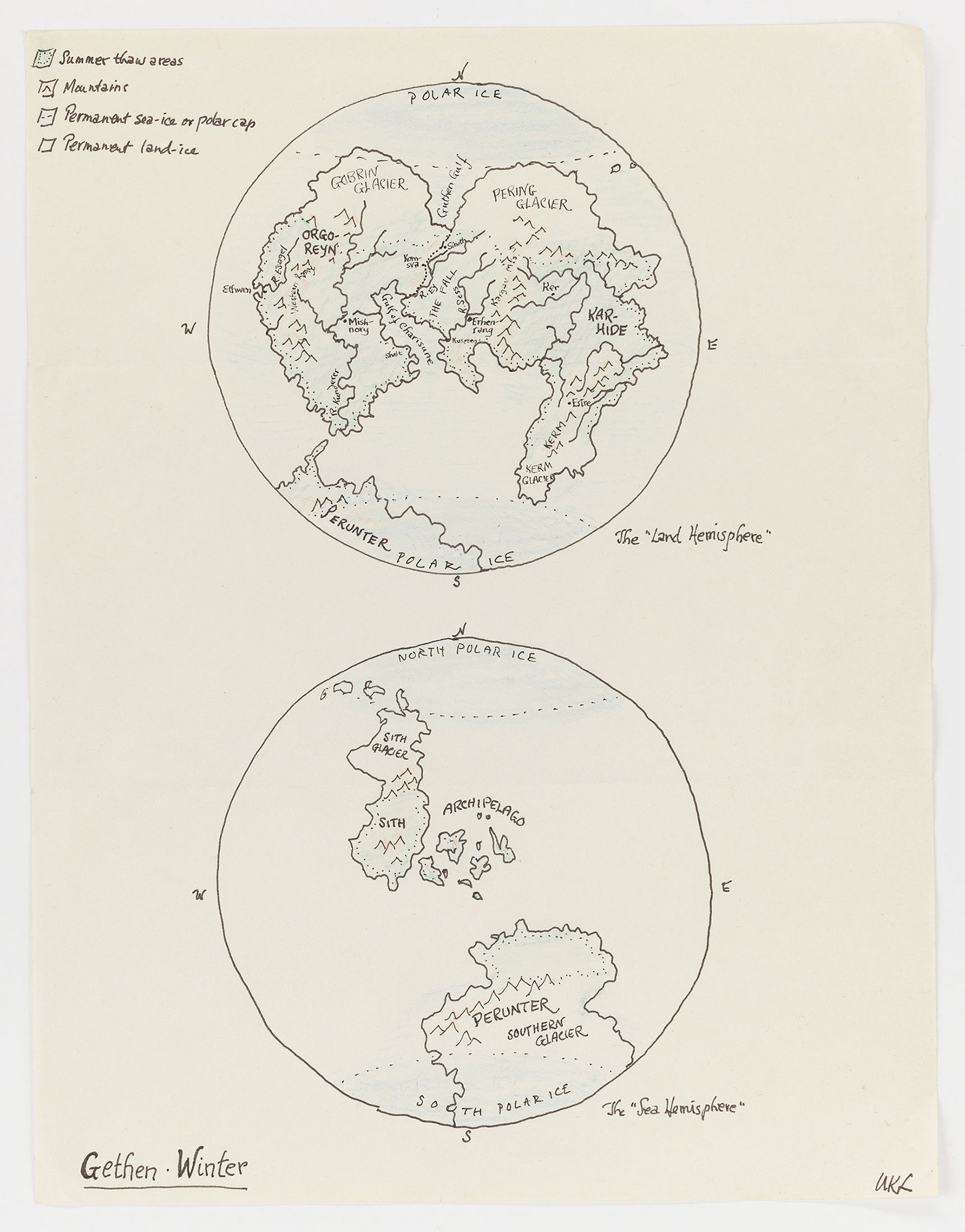 fig.iii Hemispheres of Gethen, unpublished, for The Left Hand of Darkness, 1969. Ink on typewriter paper. Courtesy Ursula K. Le Guin Foundation.