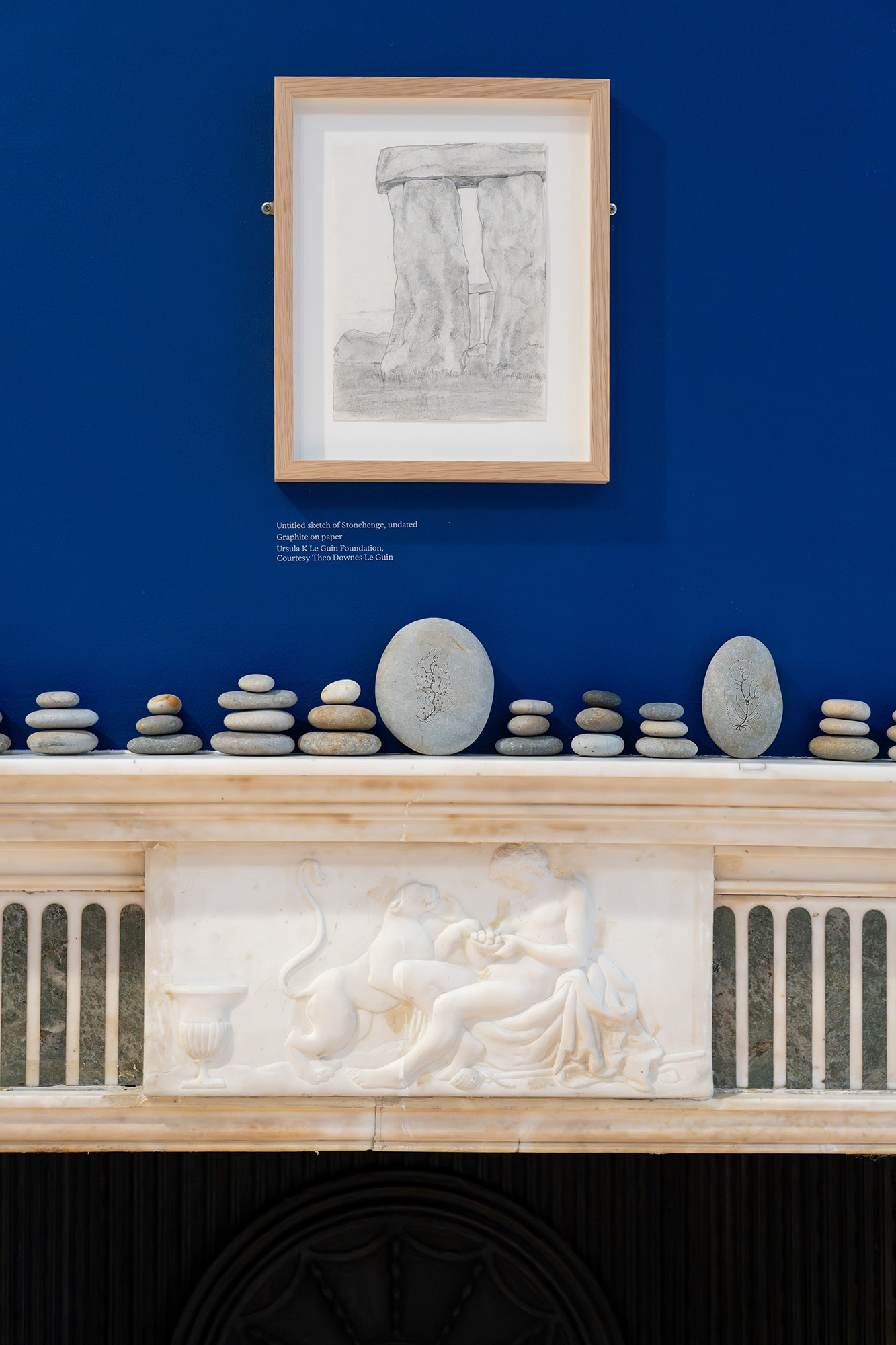 It’s tempting to think of maps – of literature, of history, of all the things that Le Guin excavates in Always Coming Home – as being permanent because they’ve been written down. But these speculative maps refuse to gesture towards the permanent or the objective. Some of their power comes from the fact that they’re so willing to lean into the subjective languages and philosophies of Le Guin’s worlds and civilisations. Throughout The Word for World, some of Le Guin’s own drawings and paintings are placed next to the maps in her novels; an untitled pastel on paper, an undated pencil drawing of Haystack Rock in Oregon are on the wall next to a map of some of the paths around Sinshan Creek in Always Coming Home. Le Guin’s own drawings seem to challenge the ways in which we might typically understand landscapes; her drawing of Haystack Rock presents the eponymous feature in the distance, almost abstract and monolithic, while her pastel of the waves is closer to abstraction than anything else.