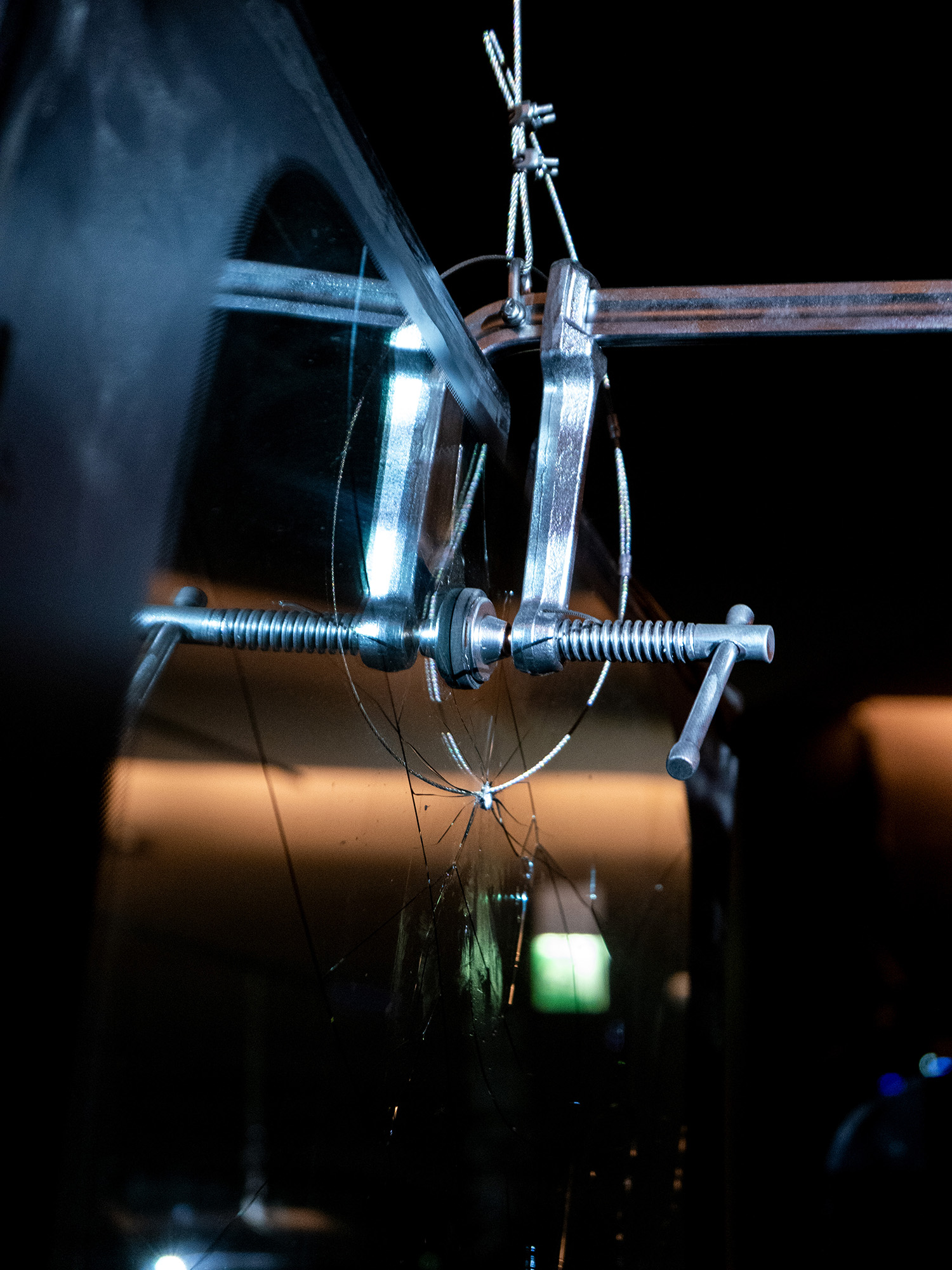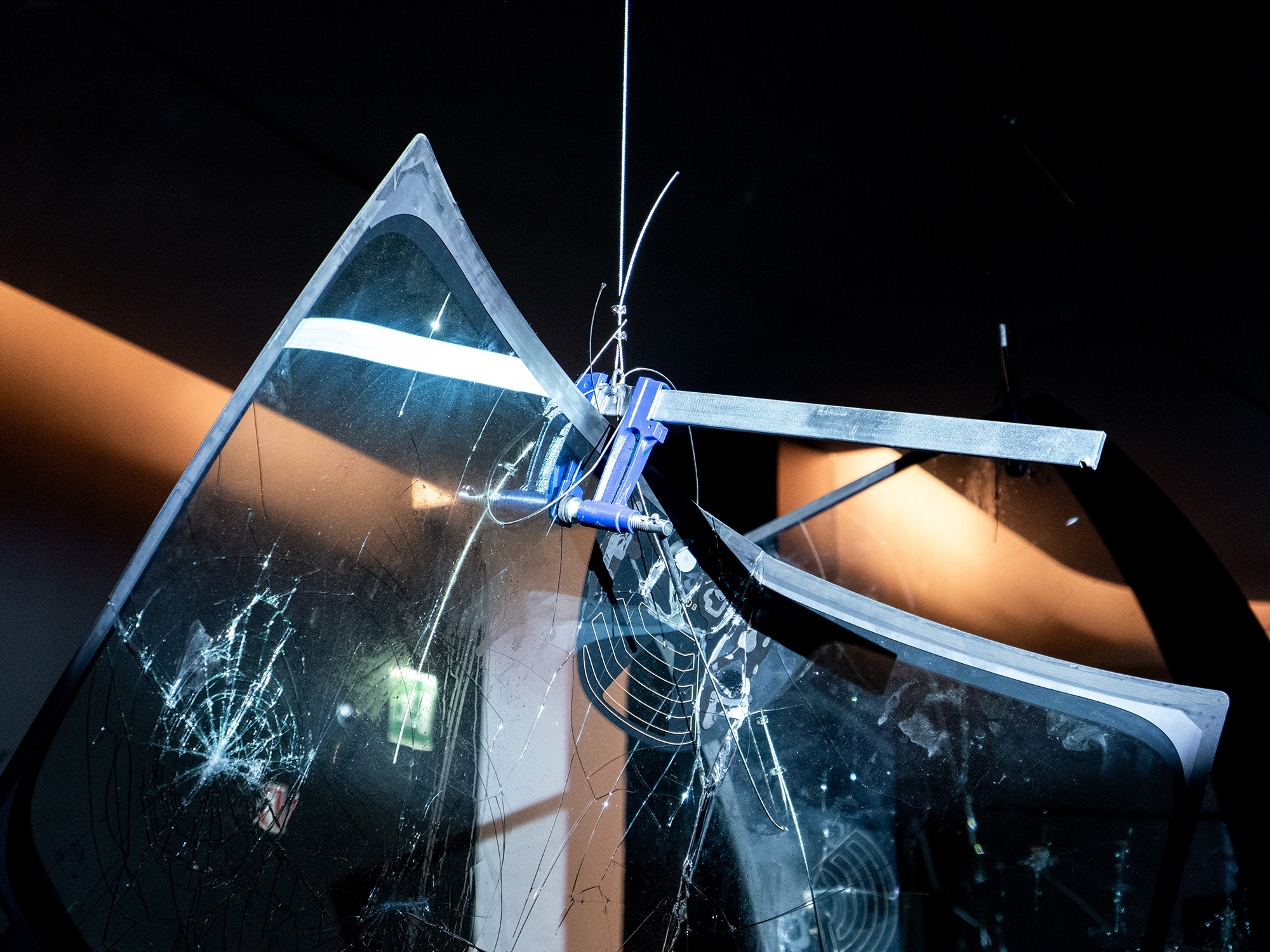 Formed of hanging smashed car windscreens hung Calder-like from the ceiling, usually the works are presented in bright, white spaces. Here, in the darkness, shot through with projection and lights, the cracked glass transforms into a post-industrial shadow puppetry. Gently rotating in the space and lights, impacted by both chance of movement and poetic interaction with Tudor’s music – sometimes soothing, sometimes harsh – the experience is exhilarating, as if time has entered a Ballardian slo-mo motorway crash, where amongst flying windscreens and musical notes there is the briefest moment of calm.