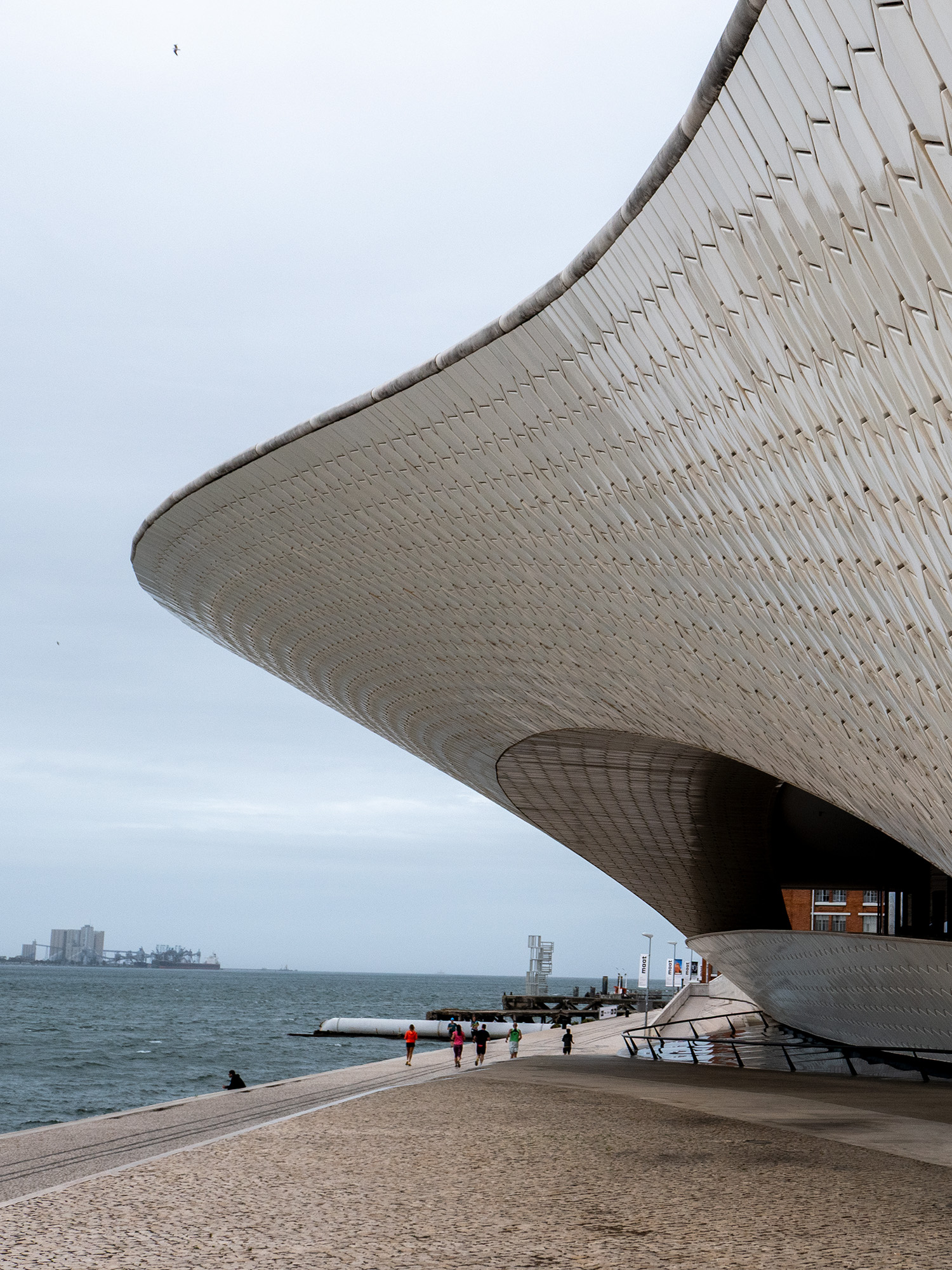 Externally, Levete’s MAAT Gallery building, now a decade old, is already a foundational part of Lisbon’s cultural and touristic boom. White ceramic surfaces seem to peel from ground level to reveal entrances and openings which let both people and natural light into the entombed gallery spaces. The void between overhang and riverside promenade has become one of the city’s most Instagrammable moments, while the roof offers visual access to a wide vista and a bridge across railway lines to the residential parts of Belém.