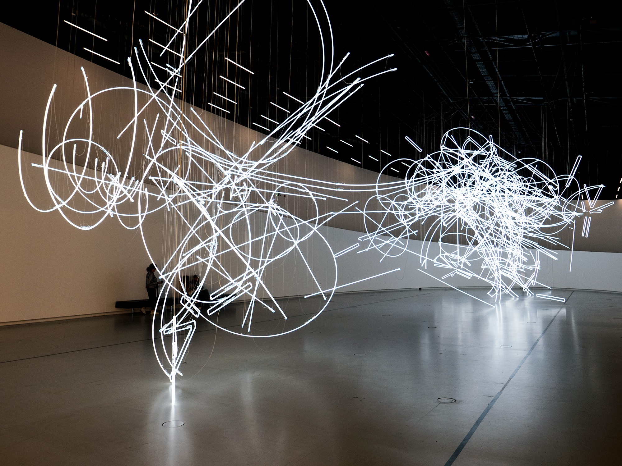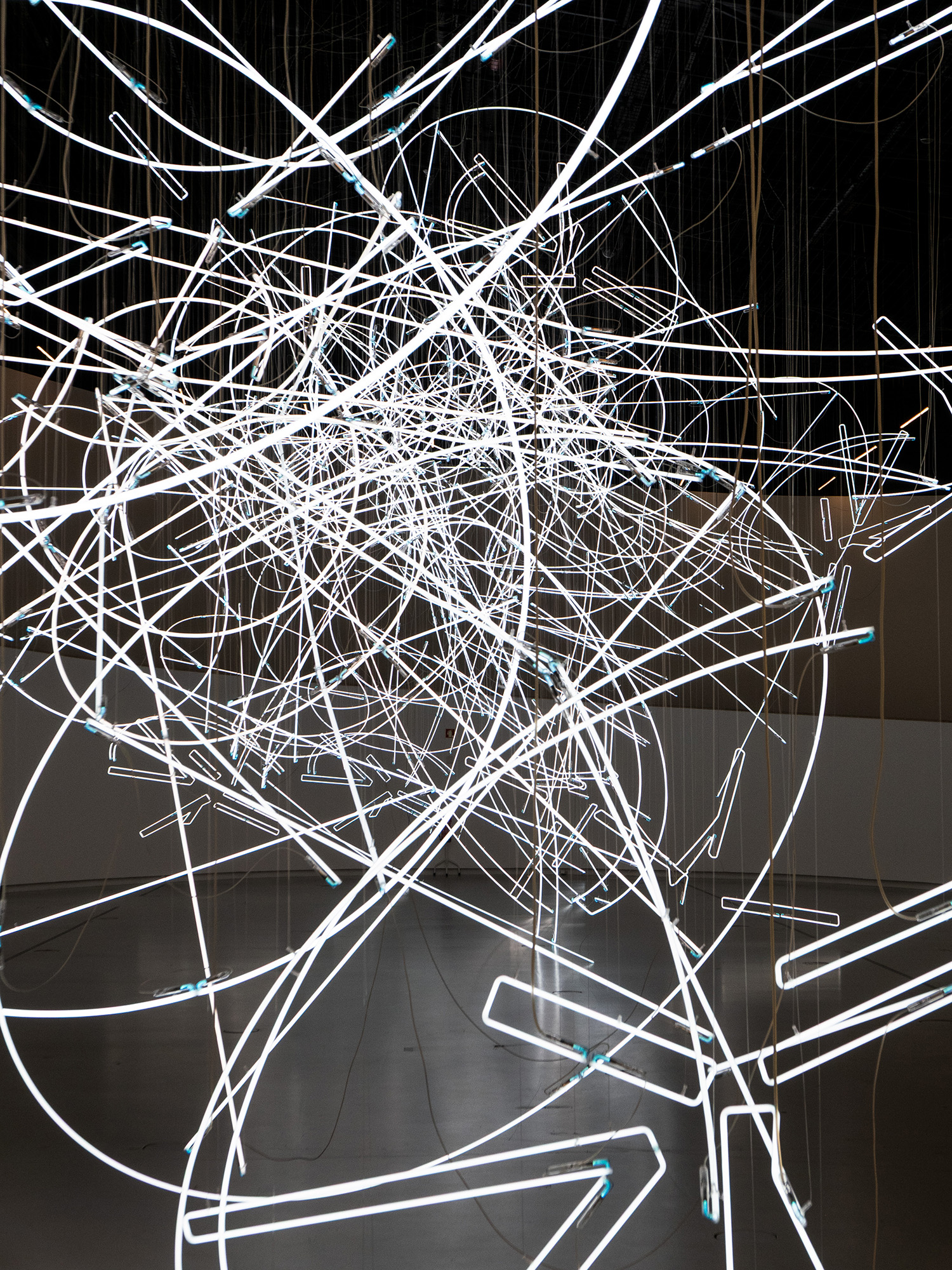 It also makes a perfect ready-made setting for Wyn Evans’ Forms in Space… by Light (in Time) (2017), an enormous entanglement of pure white light seemingly stuck in mid-explosion, comprising nearly 2km of neon. Upon entry it is arresting, and invites pause as if to capture scale, complexity, and even logistics. But as soon as some sense of it has been gained, and the visitor moves onwards along the curved ramp, it immediately transforms. Almost impossible to read, any movement around or under its interlocking arrangements completely changes its form, swooshes and lines that seemed conjoined quickly separate to show themselves as distant relatives, moments of perfect geometry twist away to reveal as sinuous, unexpected lines.