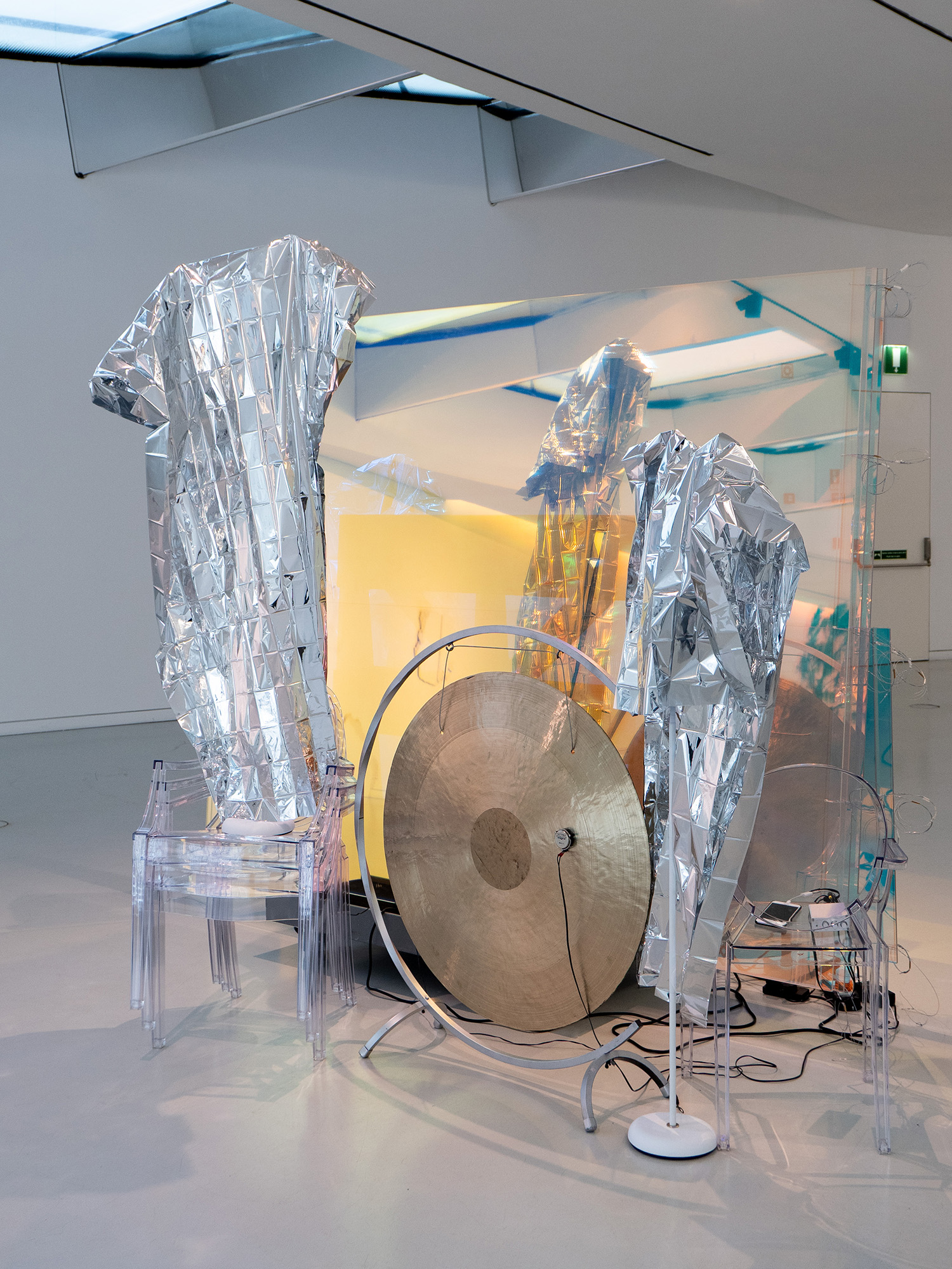 Other works seem even more precarious for the navigating visitor. Composition in Panes (on Reflection) (2017) is formed of hanging panels of low-iron glass 6-channel audio. Arranged as if to invite the visitor to get close, where they not only hear a soundwork softly reverberating from the glass but also feel an intense nervousness from the fragility.